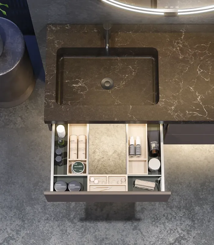 Dekton® is incredibly strong and the Trilium finish is a CO2-neutral choice that is produced with electricity from 100% renewable energy sources and contains up to 80% recycled material. Dekton®is resistant to heat and shock, it is scratch-resistant and incredibly easy to clean. You can use all usual bathroom cleaners.