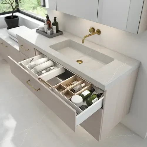 When you choose furniture for a new bathroom it is a good idea to firstly decide how you wish to use the space in your bathroom. If you want a longer worktop there will be less wall space for tall cabinets and side cabinets for additional storage. You can choose extra height vanity units instead making use of the space underneath the basin.