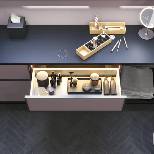 A black worktop is more than just a colour – it’s a declaration of style. It lends the bathroom an exclusive and dramatic aesthetic that creates both contrast and a sense of luxury. In the Luna range, you can opt for black oak-effect laminate, which has a dark wood grain and is both durable and easy to maintain. Silestone® worktops, available in both the Luna and Calidris ranges, come in dark hues with naturally inspired patterns that add depth and character – ideal for modern and architectural designs. Silestone® combines aesthetics with high functionality and resistance to moisture and dirt. Whether you're aiming for a dramatic focal point in your bathroom or a subtle contrast to light elements, a black worktop signals a strong sense of design and quality.