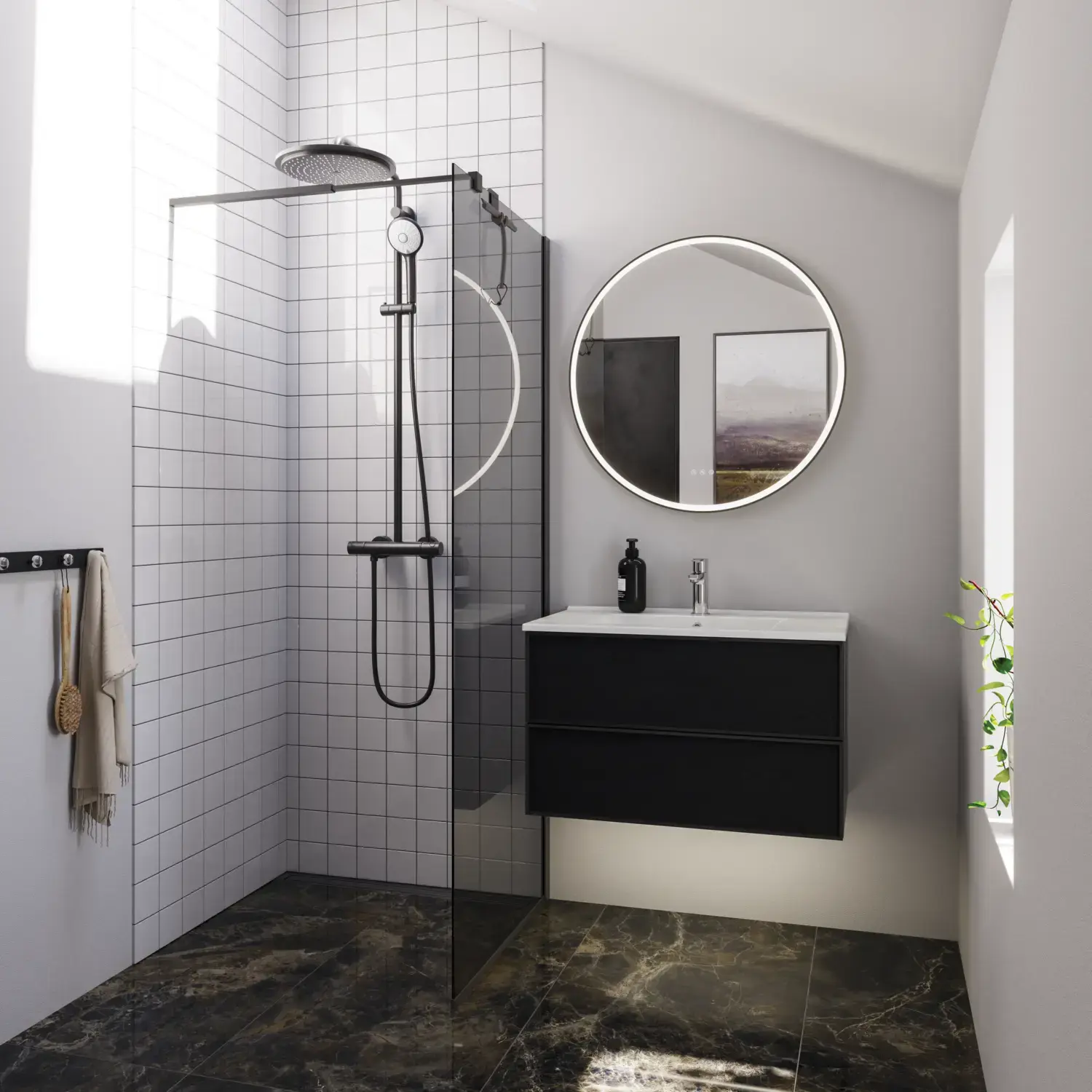 A mirror solution doesn’t have to follow the width of the basin allowing our mirror solutions to adjust to your bathroom. In a bathroom in the attic choose a narrower mirror over the basin. We offer both round and rectangular mirrors in various widths and heights with different lighting solutions.