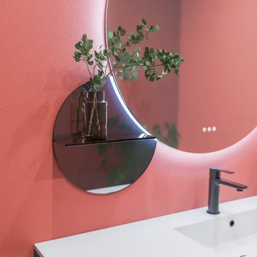 Create extra effect with the Present mirror and accompanying shelf. Mirrors for decoration are another trend and the tinted effect on both mirror and shelf helps create the look in this bathroom.