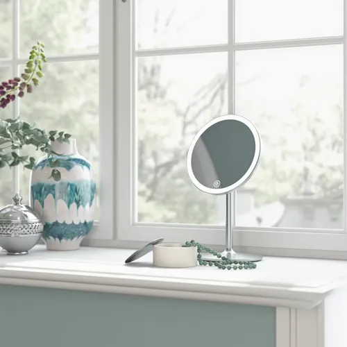 With our elegant and functional free-standing makeup mirror you can see all the details of your face, when you apply your makeup, pluck your eyebrows etc. The mirror has built-in LED lighting to illuminate your face and has 5-times magnification.