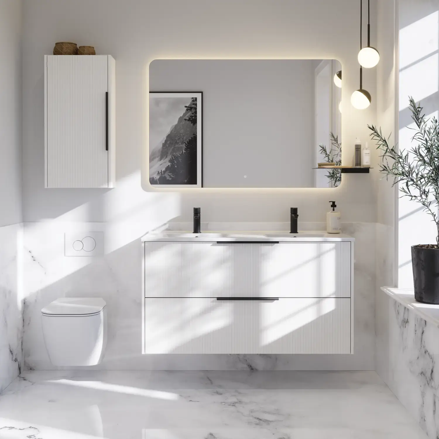 Among our bathroom accessories you will find a downlight for vanity units & cabinets with motion sensor control. You can easily move around the bathroom at night and avoid turning on the main bathroom light which can rouse you from your slumber. Also it’s a nice feature when you have small children. In addition to being practical, the light creates an inviting atmosphere in the bathroom as well. Add a downlight when you choose your vanity unit.
