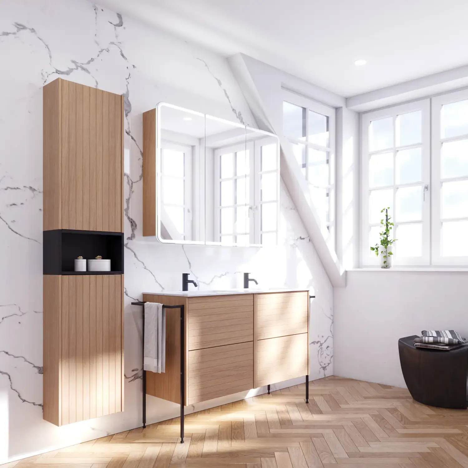 Flexibility is our keyword when designing new solutions for the bathroom interior. We would like to provide you with as many options as possible. Dansani specialises in bathrooms, and our products are defined by long-life, high-quality materials that still look good after years of use. A beautiful and functional double basin with a stylish and practical bowl area unit will give your bathroom a brand-new look in a tasteful and elegant way.