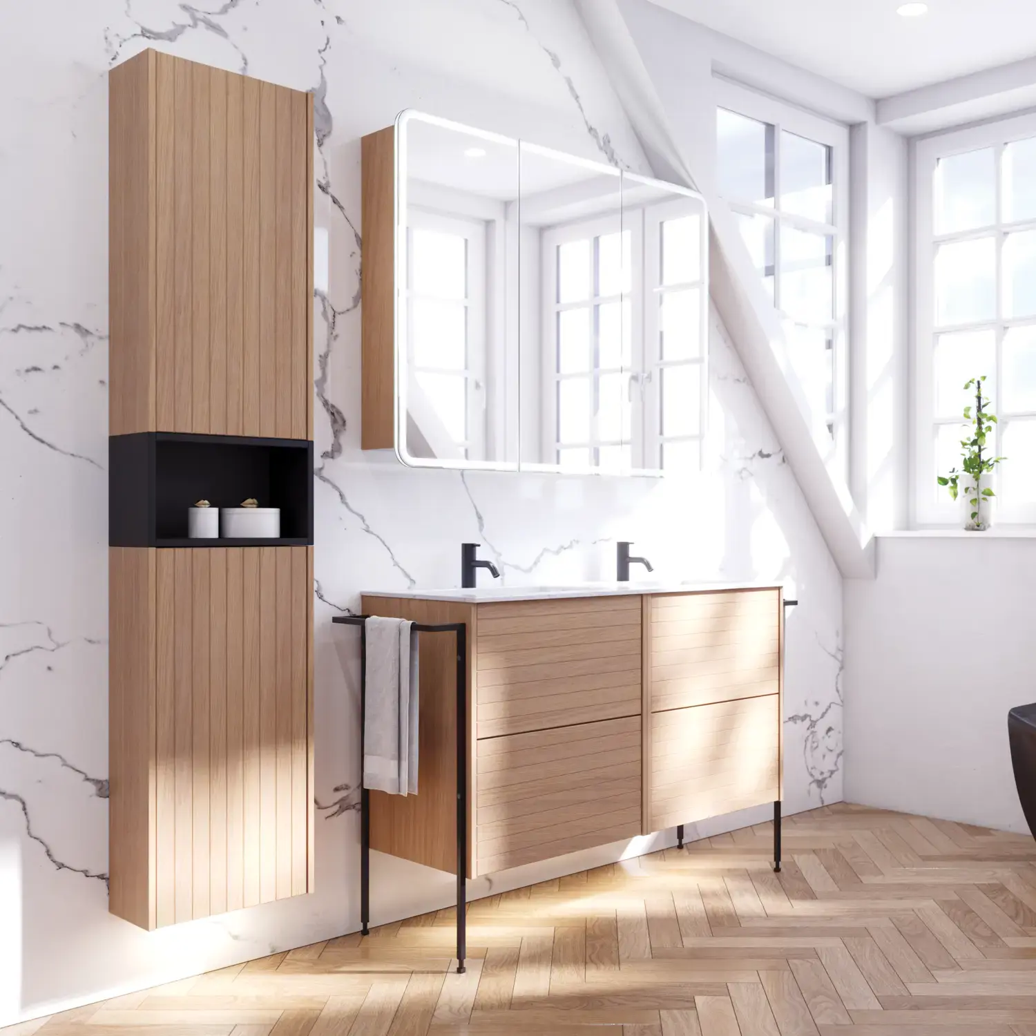 We love natural wood – from light types of wood to darker tones. Nordic decoration is light and open, with lightweight, functional furniture and beautiful, simple details. Adding natural wood to your design creates images of untamed Scandinavian scenery, and brings liveliness to the bathroom. We have wooden decors in several of our ranges, but Calidris in particular stands out in this area. All Calidris wooden elements are over-veneered on solid oak edges, and this provides uniform quality with a more beautiful, natural grain and texture. Read more about oak veneer in Calidris.