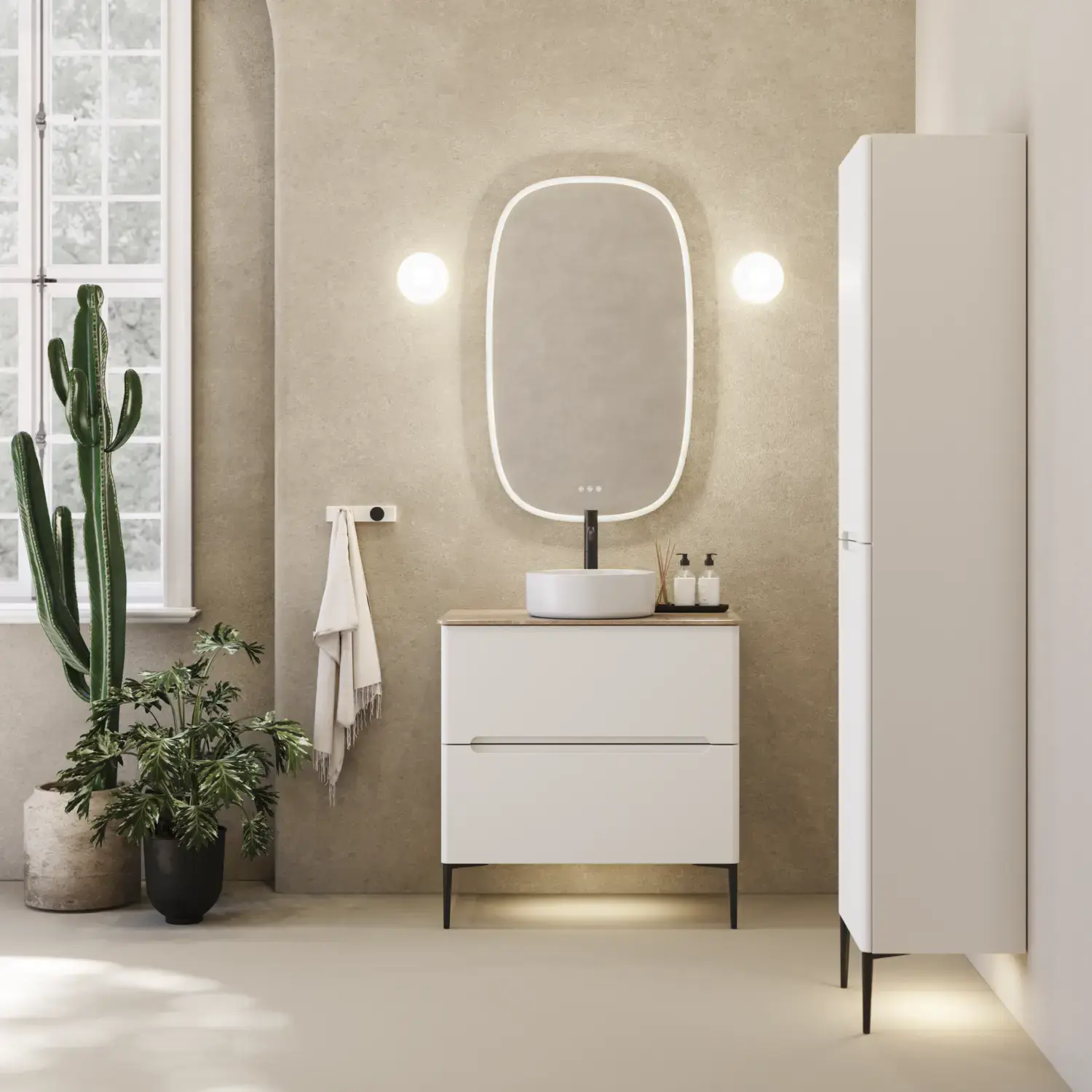Of course you can create your dream bathroom with white bathroom furniture on white walls. White can also create a cosy mood and make a bathroom exude a pleasant ambience. It is important, however, that the colours you add in the form of elements such as accessories and plant pots are gentle and warm, with surfaces that are not too sleek like plastic or steel.
