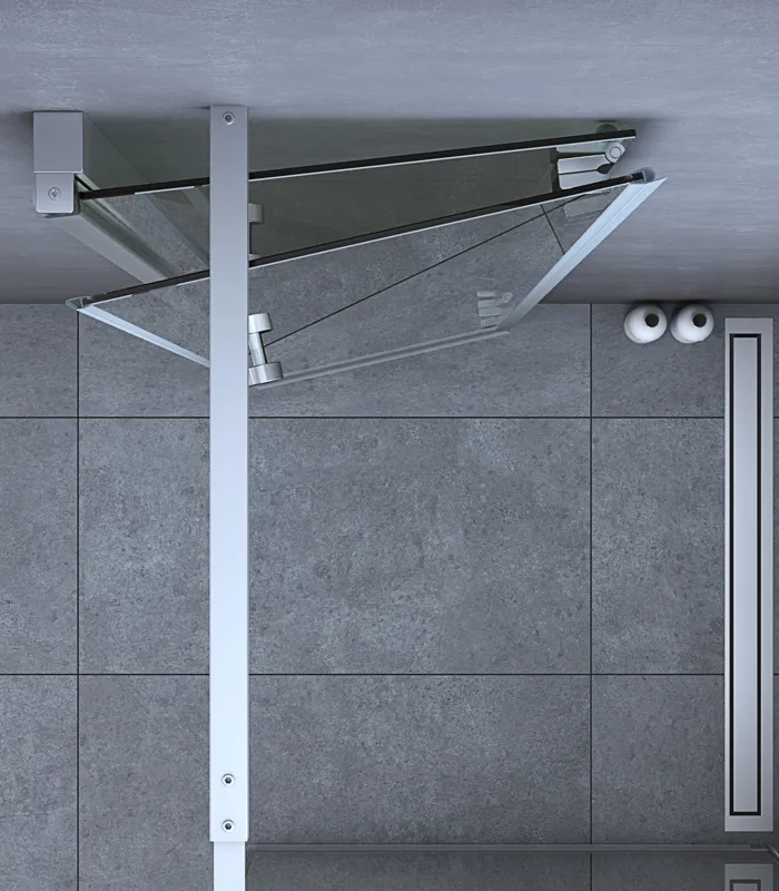Creates more space in the room as it can fold away after use. Furniture can be installed up to the shower door. Two folding doors can also be installed together to create a corner shower enclosure.