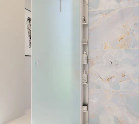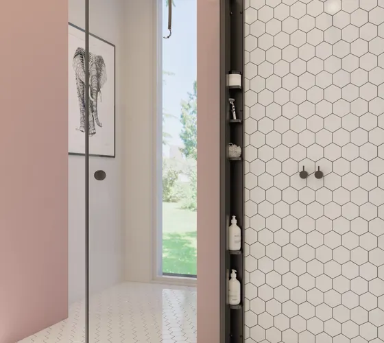 The short fixed side panel allows furniture to be installed close to the corner shower enclosure. When you are not using the shower, the doors can be pushed inwards, to give more space in the room.