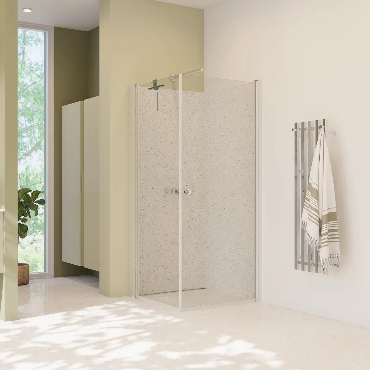 Can open inwards or outwards, leaving plenty of floor space. Two hinged doors can also be installed together to create a corner shower enclosure.
