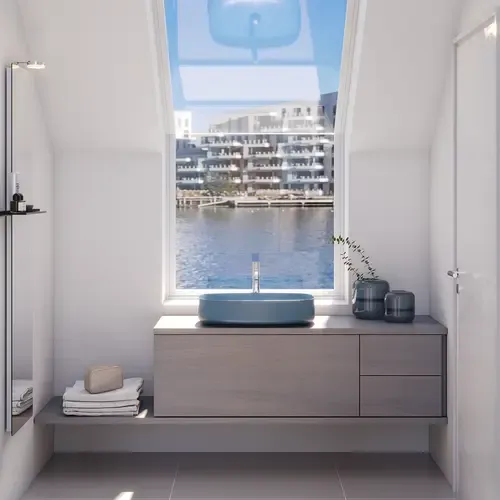 Create calm in a small room with a customised wall-to-wall solution. Be creative with sloping walls and imagine what an open shelf would look like. A large mirror makes the room seem larger and the beautiful countertop basin with soft lines makes a quite unique bathroom.