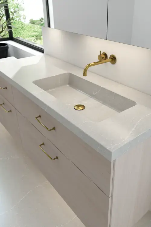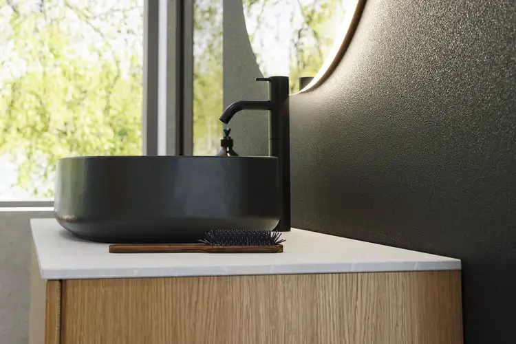 Whether a drawer or door front has a handle or not defines the style and appearance of your bathroom suite. Therefore it is an important decision which solution to choose for your furniture. You have the absolute freedom to give your bathroom personality. Create beautiful contrasts with a wide range of handles in beautiful forms and colours or choose the simple handle free solution with push-open-function where you open doors and drawers with a light push. You can also choose furniture with an elegant integrated handle which follows the width of the front and turns upwards so that water and dirt can’t accumulate.