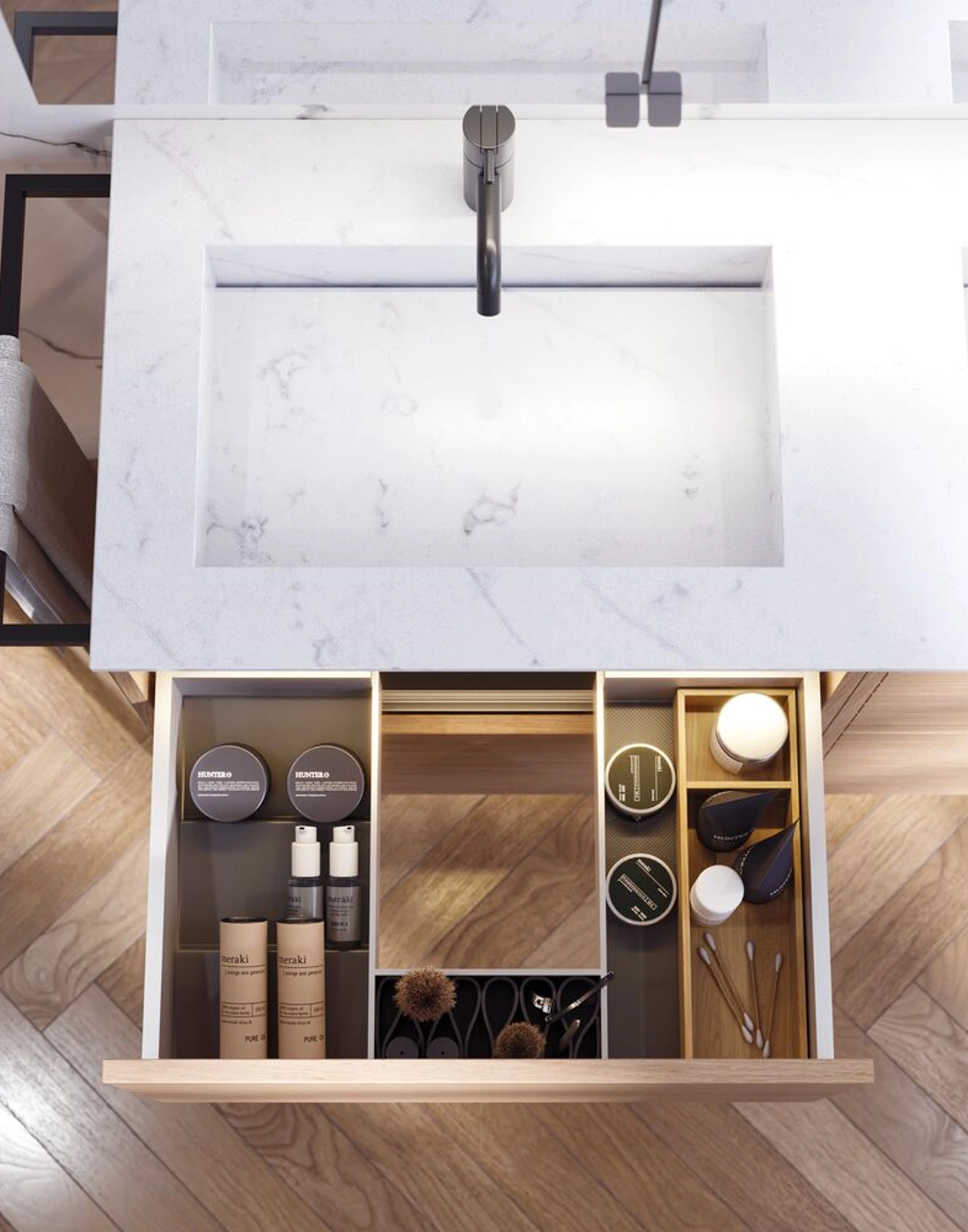 The Angular basin represents the perfect choice for modern bathrooms with its minimalist look and sharp, angular design. The basin was developed in close collaboration with Cosentino and is available in the popular Silestone finishes as well as the sustainable Dekton finish, Trilium. Trilium is known for its raw, industrial look and is made from up to 80% recycled materials, making it a responsible choice, both aesthetically and environmentally. The basin is made from pieces of stone that are bonded together to create an elegant and functional basin. The bottom of the basin is sloped to direct the water efficiently towards the narrow, hidden drain that spans the width of the basin, giving it a sleek and functional appearance. The Angular basin is an ideal solution for those who want both a beautiful and sustainable element in their bathroom, where design and function go hand in hand.