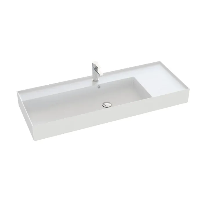 The Azym basin in the left-side positioned version combines an elegant, asymmetrical design with practical functionality. The basin is placed on the right side, providing plenty of space for storage on the left side — perfect for keeping your items within easy reach. The faucet and drain are centered, ensuring the basin fits effortlessly with all of our furniture. With its large basin and practical countertop space, Azym is both functional and stylish. The upper edge prevents water from spilling over, ensuring a dry and neat bathroom. The Azym basin is an ideal choice for those looking for a modern design, and the basin can even be wall-mounted for a minimalist look.