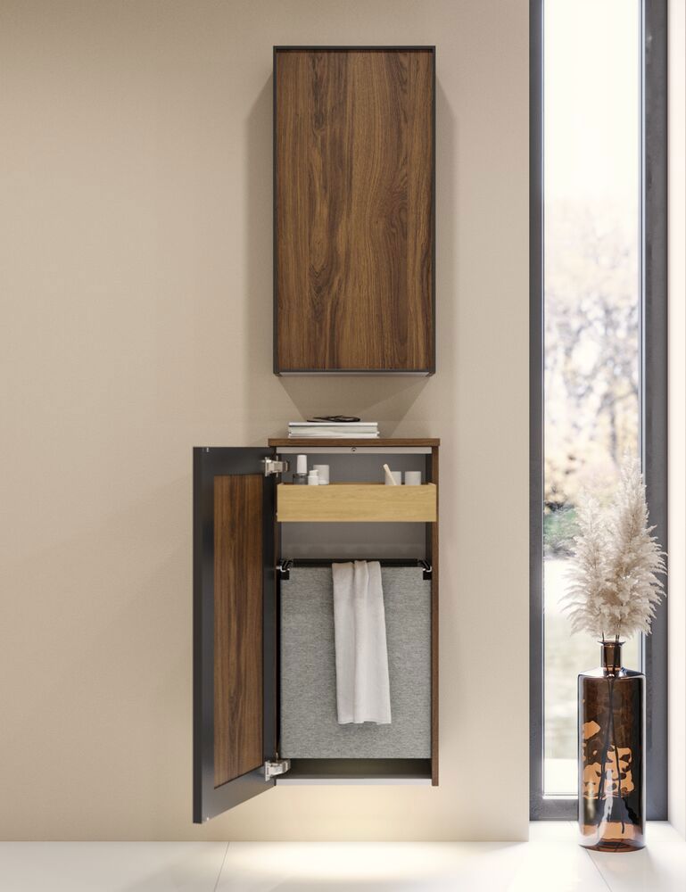 The base cabinet with a black frame in Version B offers a functional and stylish solution for your bathroom. With a width of 40 cm and a depth of 35 cm, this base cabinet is equipped with a pull-out tray and a laundry bag, making it ideal for storing both cosmetics and laundry. The black frame adds a modern edge to your bathroom, while the practical design ensures that everything remains organized and easily accessible. With this base cabinet, you can optimize your storage space and create a tidy environment where you can easily find everything you need. NB: There is a start-up fee (BI2) for products with bespoke colour. It is an one-off surcharge per bespoke colour regardless number of products. Remember to add the little practical things to your bathroom furniture that you will enjoy on a daily basis. For example, lights in drawers and cabinets, built-in electrical sockets and dimmed sensor lights under the furniture to guide night-time bathroom visits. Options are ordered at the same time as your furniture.