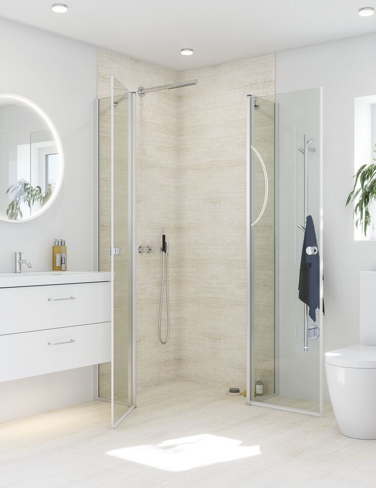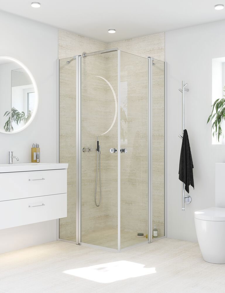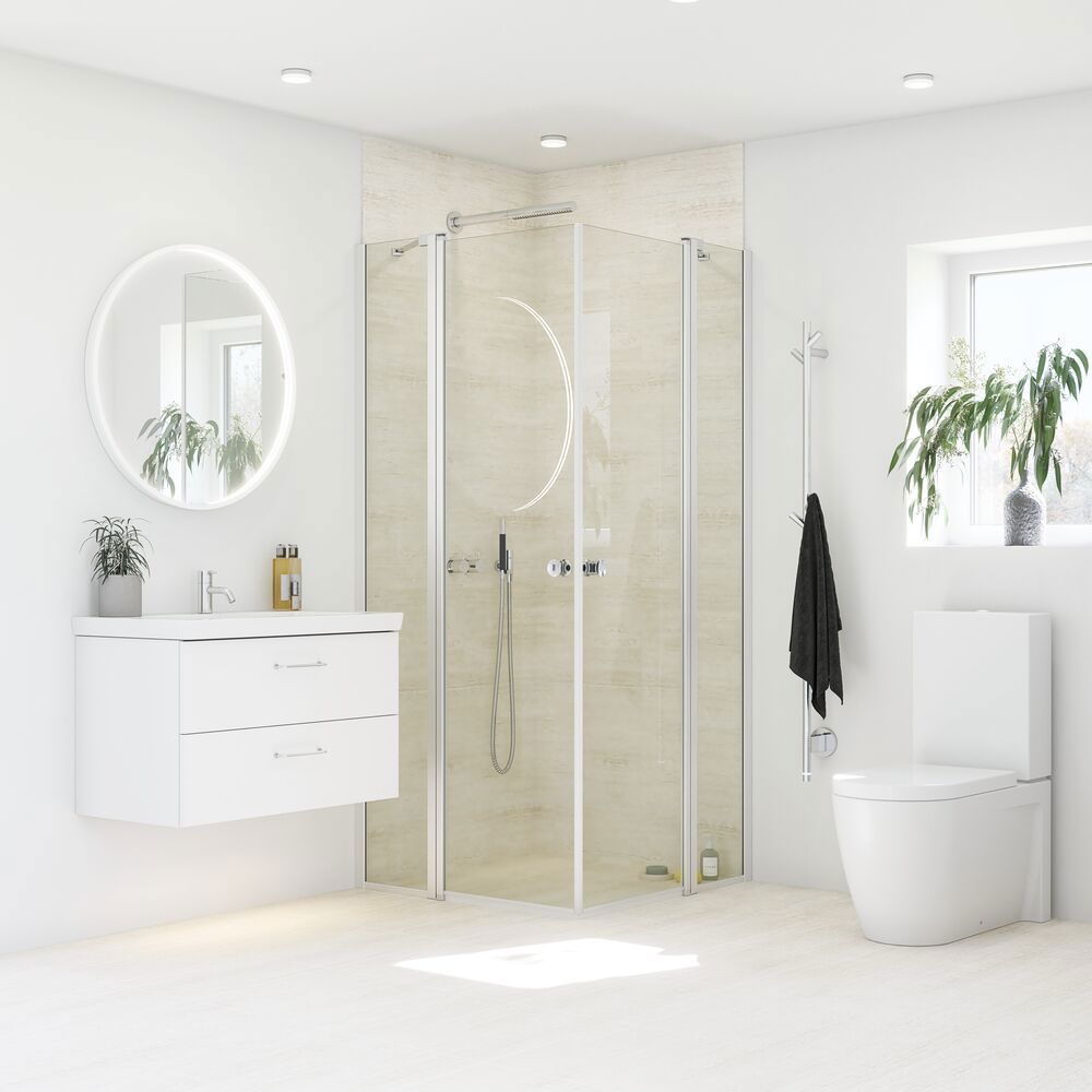 The hinged doors with in-line panel offer a stable and attractive enclosure around the shower, minimising water waste and creating a sense of privacy. You can furnish closer up to your shower door, which is handy if you have limited space. The hinged door can be pushed in without hitting the fittings when you're not using the shower, giving you more space in your bathroom. The glass is made of tempered safety glass and treated with EasyCare for long-lasting durability and safety. With Dansani's hinged doors with in-line panel, you get both an elegant and functional solution for your bathroom.