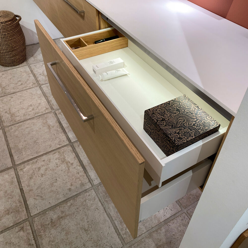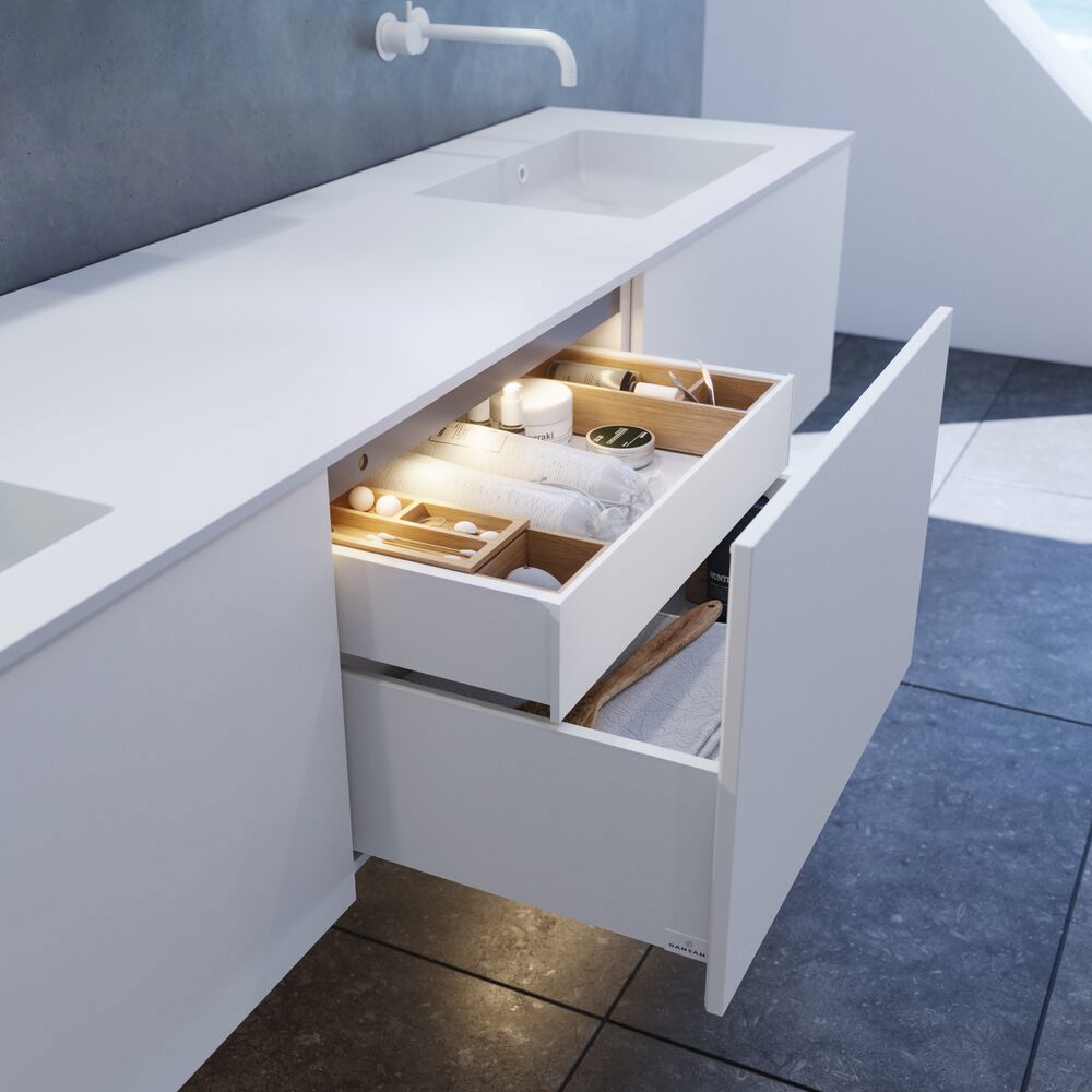 Dansani Calidris 1-drawer cabinets are the ideal solution for smart and stylish storage in the bathroom. With no space lost to wastes or drains, these cabinets are for those who opt for an asymmetrical solution with a made to measure basin, or for those who want extra storage elsewhere in the bathroom. The spacious drawer allows you to keep your bathroom organised and there's plenty of room for creams, shampoos and more. The Dansani Calidris cabinet gives you the opportunity to organise your bathroom in a uniform and beautiful way. NB: There is a start-up fee (BI2) for products with oak and bespoke colour. It is an one-off surcharge per oak and bespoke colour regardless number of products. Remember to add the little practical things to your bathroom furniture that you will enjoy on a daily basis. For example, lights in drawers and cabinets, built-in electrical sockets and dimmed sensor lights under the furniture to guide night-time bathroom visits. Options are ordered at the same time as your furniture.