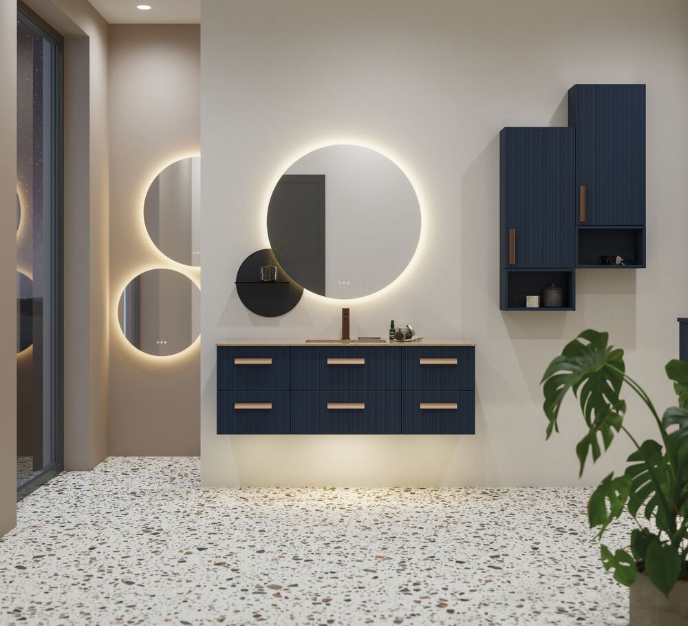 Renew your bathroom with cabinets that feature 2 functional drawers and no waste cut-out. These cabinets are 48 cm high and showcase an elegant fluted front that adds a unique and stylish appearance. Ideal for modern bathrooms, they can easily be paired with a vanity unit and a countertop with a freestanding basin. The fluted front enhances character and depth in your bathroom while providing ample storage space for your essentials. With these cabinets, you enjoy both functionality and aesthetics in a single solution. NB: There is a start-up fee (BI2) for products with bespoke colour. It is an one-off surcharge per bespoke colour regardless number of products. Remember to add the little practical things to your bathroom furniture that you will enjoy on a daily basis. For example, lights in drawers and cabinets, built-in electrical sockets and dimmed sensor lights under the furniture to guide night-time bathroom visits. Options are ordered at the same time as your furniture.