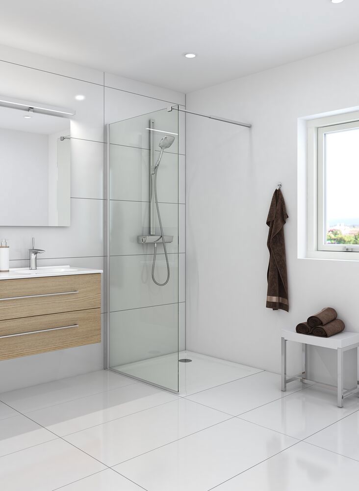 The fixed panels are designed with a focus on creating a spacious and stylish shower area that can be fully customised to your personal style and the dcor of your bathroom. Our fixed panels can be combined with other shower panels or shower doors, giving you the opportunity to create a solution that fits perfectly into your bathroom. Maybe you have a lot of space and can create a walk-in shower? Or maybe you want to combine the fixed panel with a hinged door for a stable and safe solution? Whatever you choose, you can find the solution that suits you best. The glass in the fixed panels is treated with EasyCare, a special coating that repels water and soap residue, making cleaning much easier. The glass is also tempered, and the strong construction and solid materials ensure that the walls are stable and reliable.