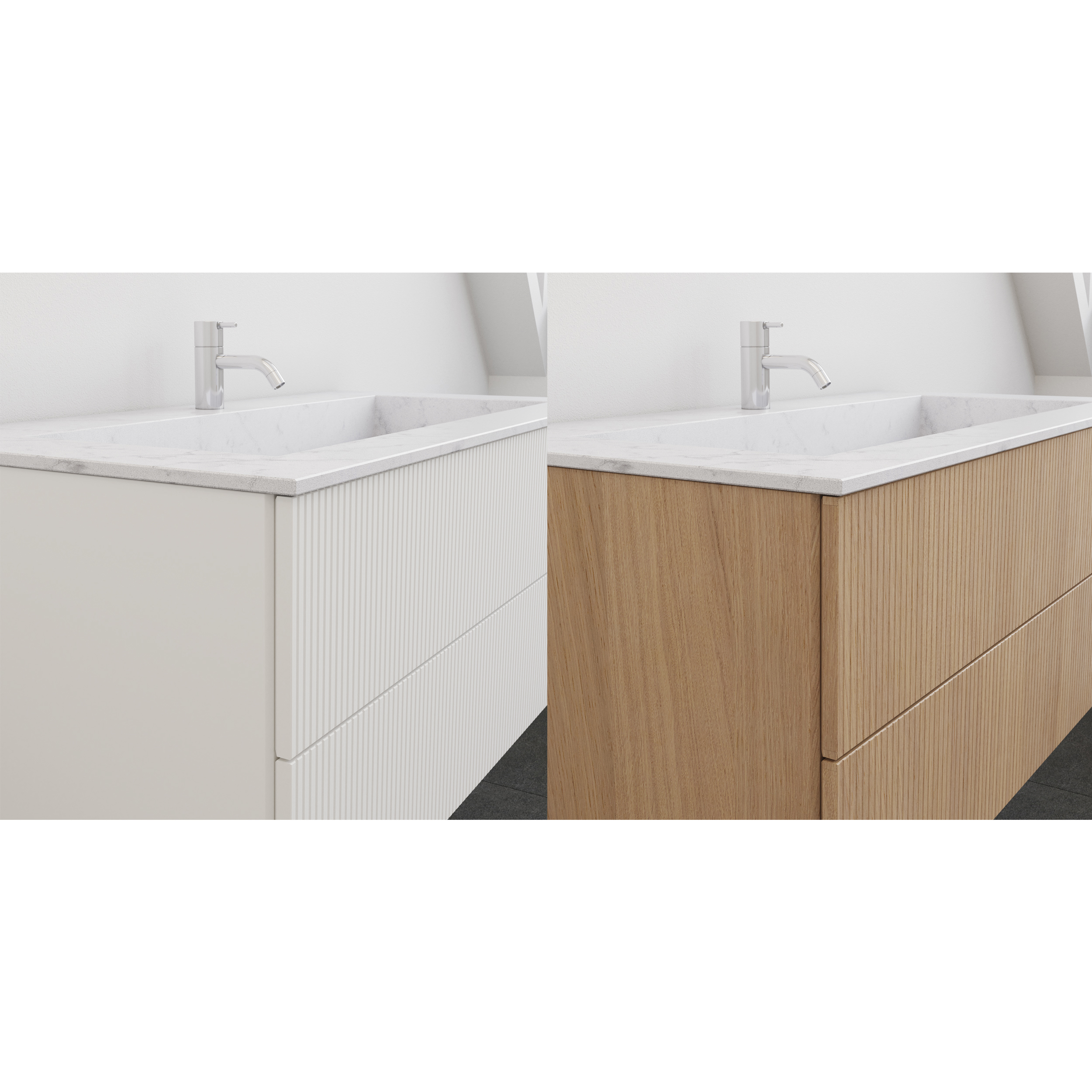 Give your bathroom furniture a modern and exclusive look with a narrow grooved front from Calidris. The fine vertical lines create a vibrant play in the surface and add a unique structure that gives the bathroom character and elegance. Available in several colors and beautiful wood veneer, you can choose exactly the mood that suits your style - from warm and natural to cool and sophisticated. The grooved surface is a strong design detail that elevates your bathroom furniture to something special. NB: This front works as an option for your furniture, so first select the size and item number of your bathroom furniture and then add the optional front to your order.