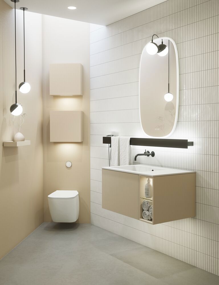 For your open shelving unit, you can choose to have the sides with narrow grooves. This creates a beautiful coherence in the design - especially if you have already chosen a vanity unit with grooved fronts and sides. The continuous lines create a harmonious and exclusive look where even the open shelving becomes an integral part of the whole. A small detail that elevates the bathroom to a truly high-end design space.