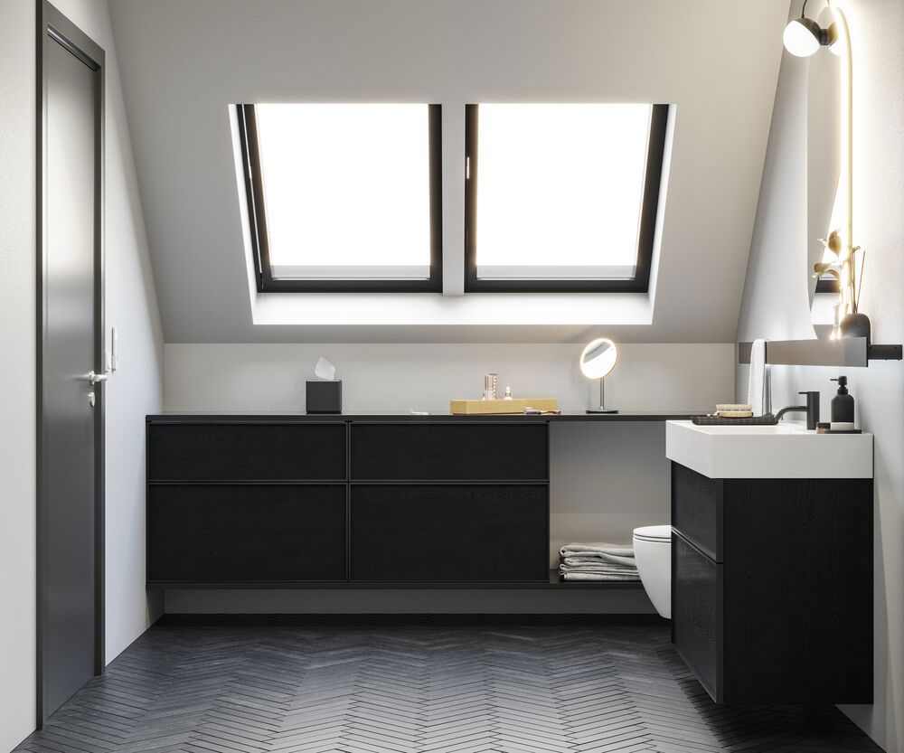 Illumi is a unique shelf, characterised by its black aluminium edge and dark tinted glass shelves, created to complement the asymmetrical set where Illumi extends beyond the furniture to create an eye-catching design element. Not only is the Illumi shelf a visual statement, but it also offers practical features that make it ideal for the bathroom. The tinted glass pieces can be removed so you can use Illumi as a towel holder, and there are lights in the shelf that provide a beautiful light over your sink and vanity unit.  The Illumi shelf integrates luxury and ease of use into your bathroom. More than just a storage solution, this shelf is a carefully selected design experience that combines aesthetics with functionality, creating a bathroom environment that is both beautiful and practical.