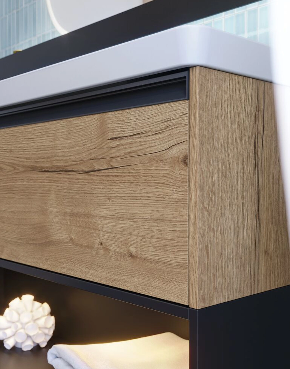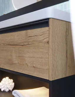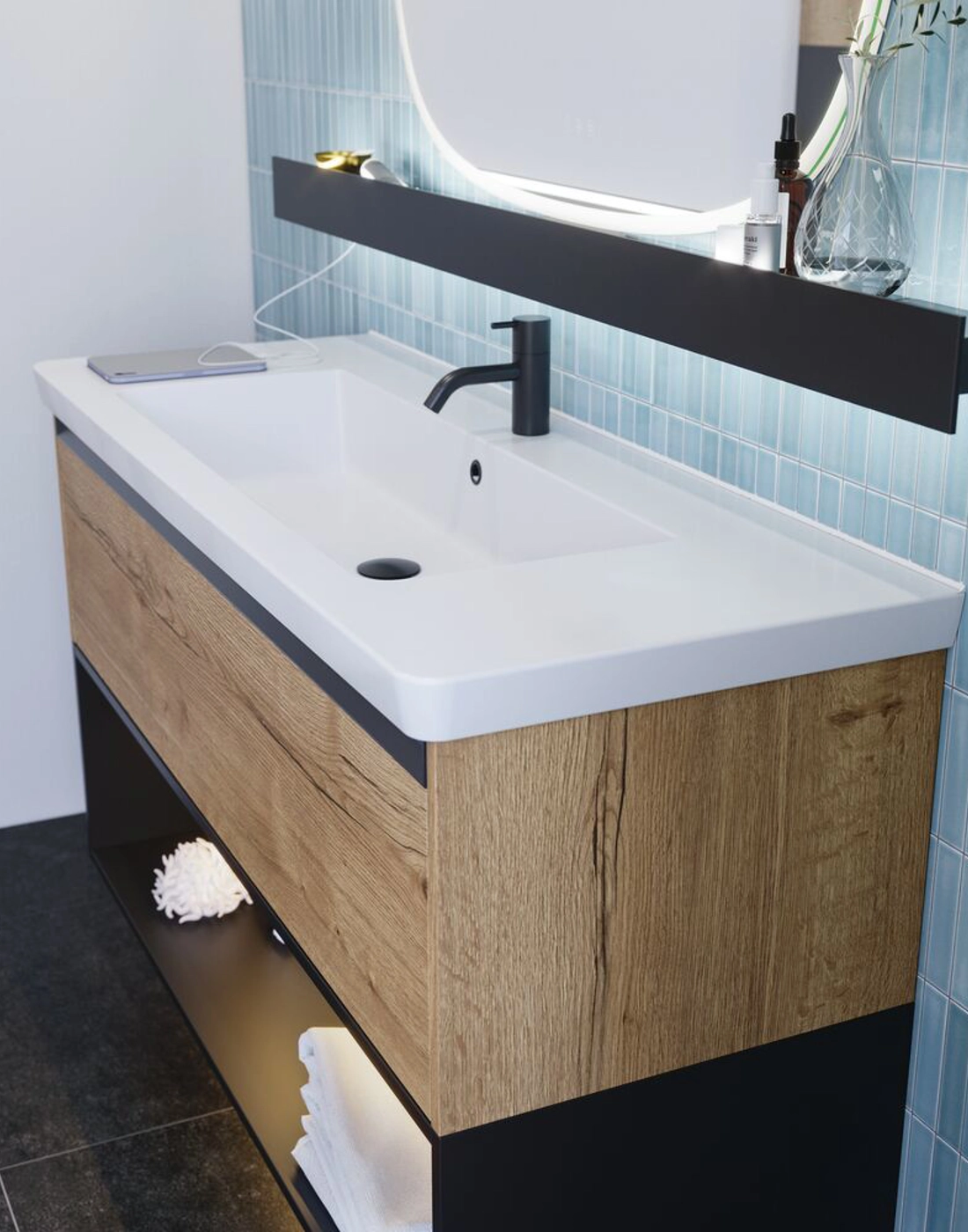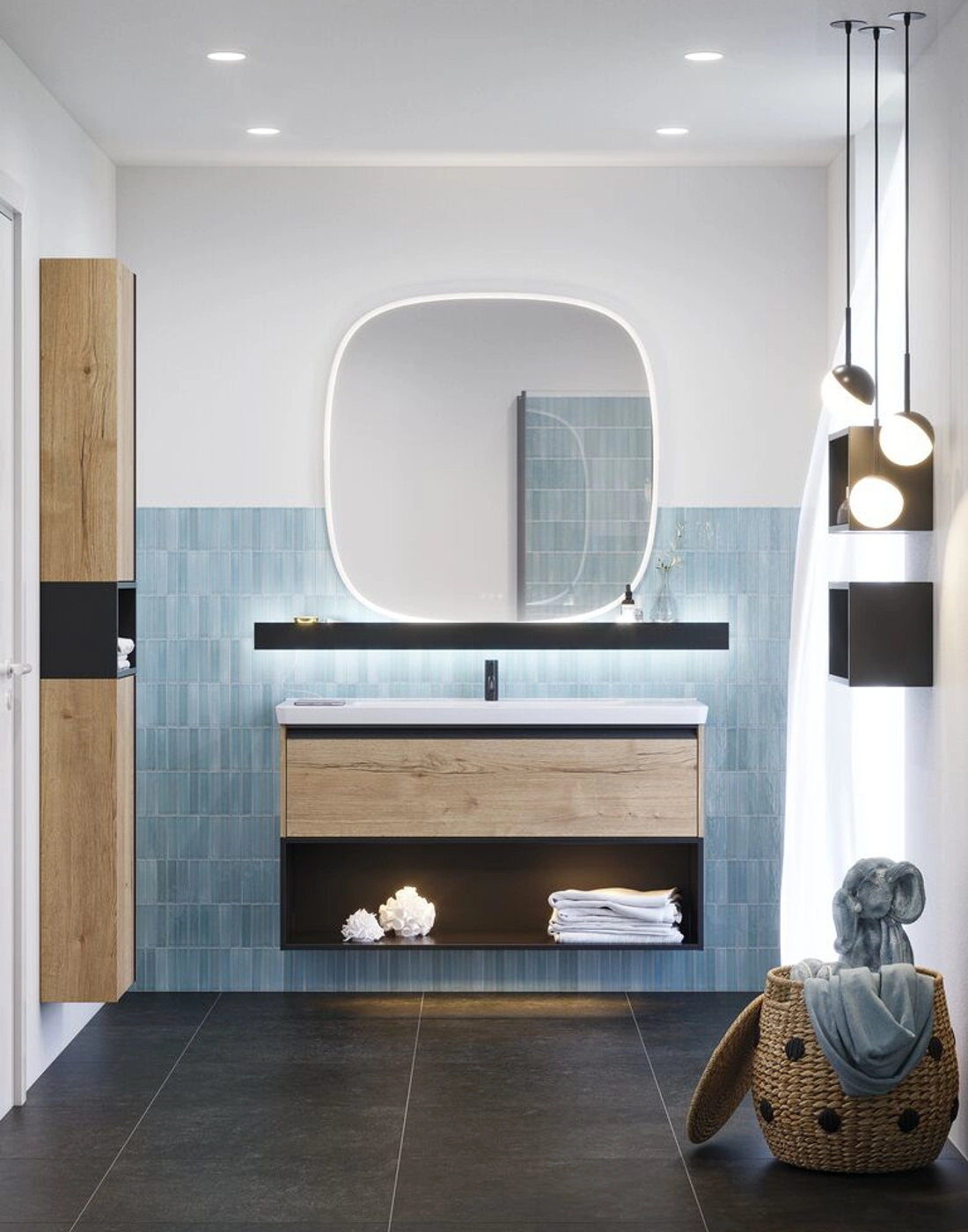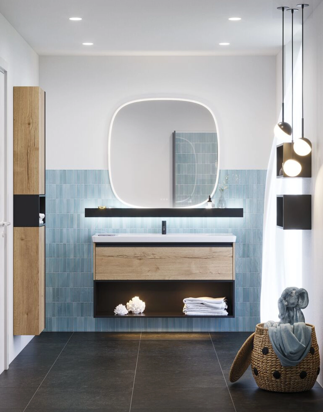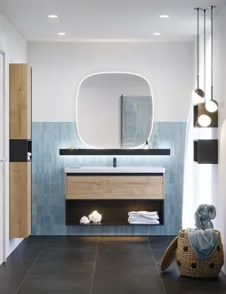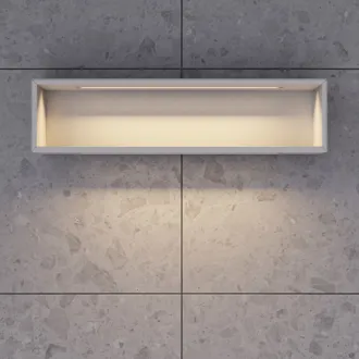 Internal lighting (IP21) and LED downlight to floor incl. motion sensor (IP44) and wireless lighting control (IP44) NOTE: Requires a constant electrical feed to the vanity downlight as well as a mirror solution with wireless lighting control and an external switch. You can combine mirrors, spotlights and pendant lights in a group, so they can be adjusted together at a single touch. Adjusting the mirror lighting will also adjust the colour and brightness of the spotlights and pendant lights.