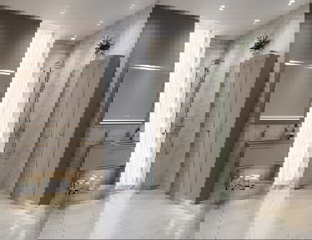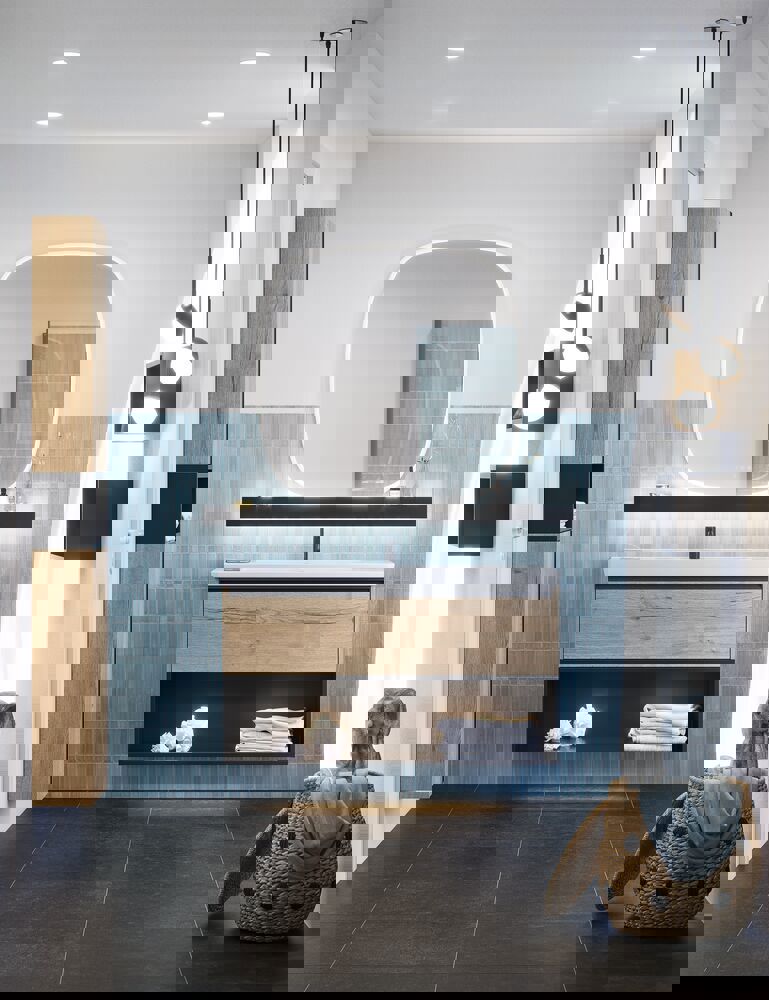 Internal lighting (IP21) and LED downlight to floor incl. motion sensor (IP44) and wireless lighting control (IP44) NOTE: Requires a constant electrical feed to the vanity downlight as well as a mirror solution with wireless lighting control and an external switch. You can combine mirrors, spotlights and pendant lights in a group, so they can be adjusted together at a single touch. Adjusting the mirror lighting will also adjust the colour and brightness of the spotlights and pendant lights.