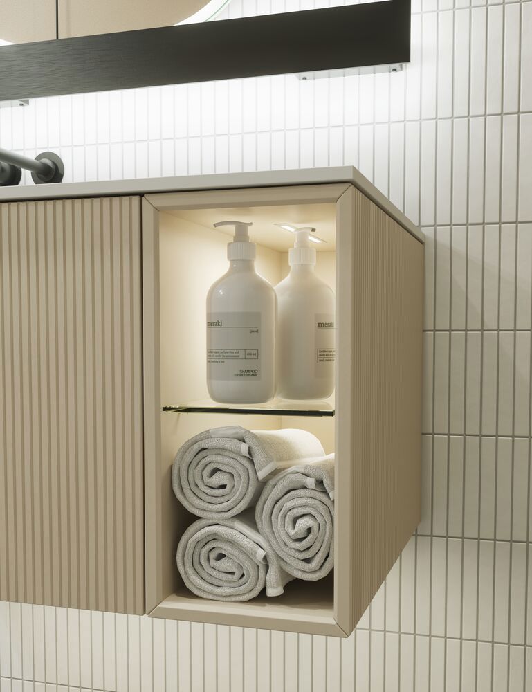 Add light under the Calidris open shelving for a beautiful floating effect that gives your bathroom an extra dimension of elegance. Wireless light control also gives you full control, so all the light in the room - both in the furniture and mirror - can be controlled together directly from the mirror. Here you can easily adjust the brightness and color temperature to create the perfect ambience for both everyday routines and quiet moments.