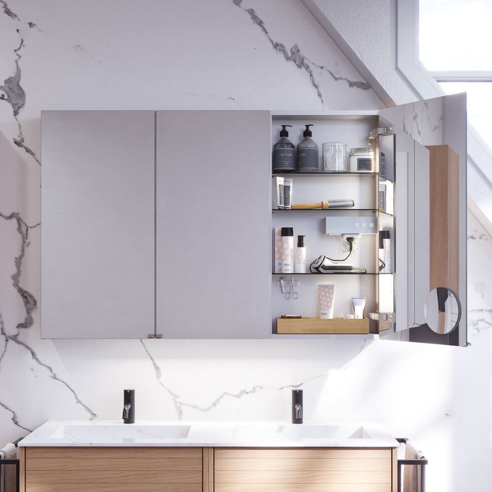 Get practical storage and stylish design with the Style mirror cabinet. The mirror cabinet is perfect for storing all your creams, deodorant, nail clippers, toothbrushes and more. Add lights to the mirror cabinet and control the colour and strength of the light with a single touch. The beautiful mirror cabinet includes a magnetic accessory holder, metal shelf, magnifying mirror and electrical socket, making your morning and evening routines much easier. NB: There is a start-up fee (BI2) for products with bespoke colour. It is an one-off surcharge per bespoke colour regardless number of products.