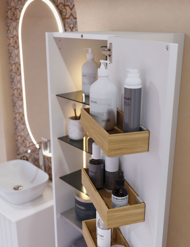 Create a welcoming atmosphere in your bathroom with this tall cabinet with grooved front in version B. This 176 cm tall cabinet has one wooden shelf, three shortened glass shelves, three wooden trays on the door and two glass shelves. The spacious storage space ensures you have everything within reach, while the grooved details add a classic touch to the decor. The tall cabinet is perfect for storing toiletries, towels and other essentials, and its stylish design makes it an aesthetic part of your bathroom. NB: There is a start-up fee (BI2) for products with bespoke colour. It is an one-off surcharge per bespoke colour regardless number of products. Remember to add the little practical things to your bathroom furniture that you will enjoy on a daily basis. For example, lights in drawers and cabinets, built-in electrical sockets and dimmed sensor lights under the furniture to guide night-time bathroom visits. Options are ordered at the same time as your furniture.