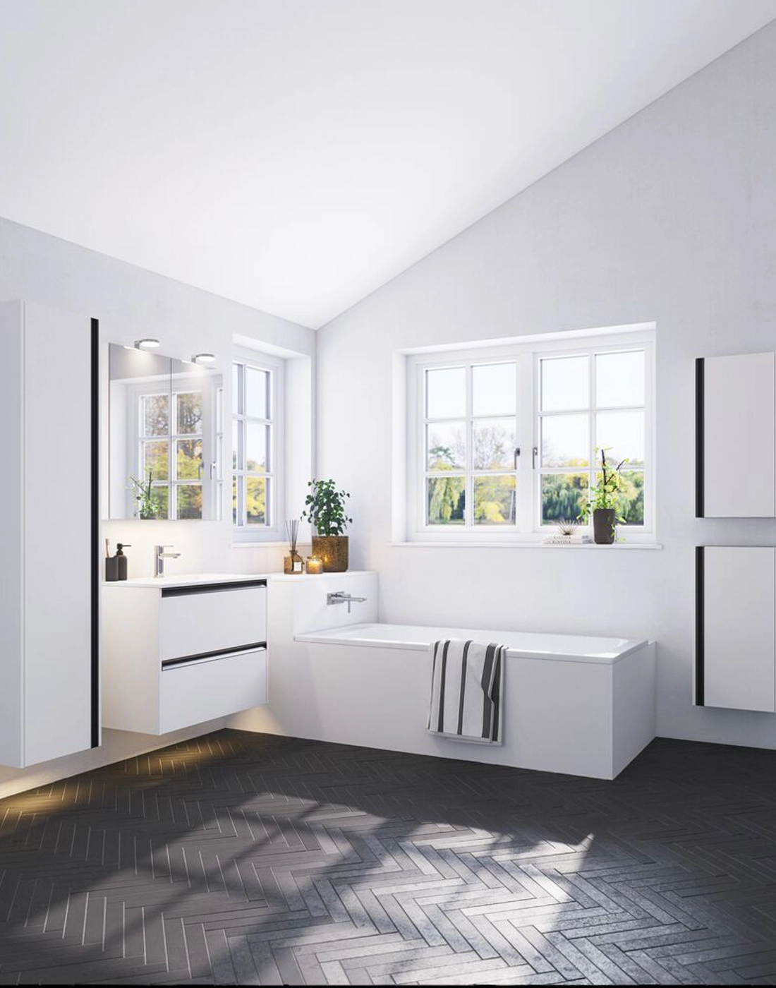 The tall cabinet in Version B with an integrated handle is perfect for those who desire both style and functionality. With one wooden shelf and three shortened glass shelves, this cabinet is ideal for storing various bathroom items. The three wooden trays on the door are perfect for small items, while the two glass shelves allow you to display your favorite products. The elegant black handle creates a striking contrast, adding a refined touch to your bathroom. NB: There is a start-up fee (BI2) for products with bespoke colour. It is an one-off surcharge per bespoke colour regardless number of products. Remember to add the little practical things to your bathroom furniture that you will enjoy on a daily basis. For example, lights in drawers and cabinets, built-in electrical sockets and dimmed sensor lights under the furniture to guide night-time bathroom visits. Options are ordered at the same time as your furniture.