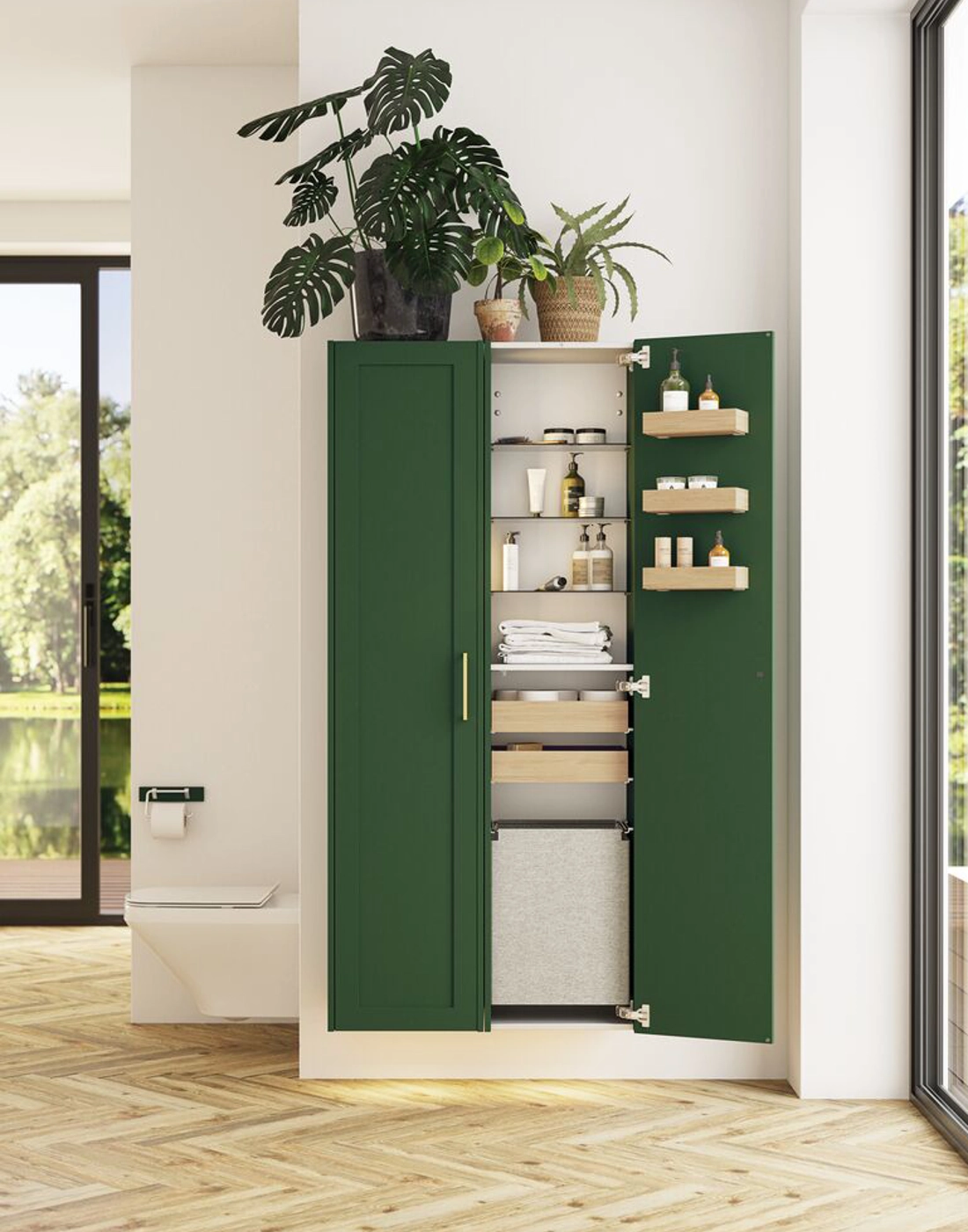 For a combination of elegance and functionality, choose the tall cabinet with a classic frame front in Version C. This cabinet includes one wooden shelf, three shortened glass shelves, three wooden trays on the door, two pull-out trays, and a laundry bag. This combination offers ample space to keep your bathroom organized, while the classic frame front creates a warm and inviting atmosphere. Make your bathroom a sanctuary where you can relax and enjoy your surroundings. NB: There is a start-up fee (BI2) for products with bespoke colour. It is an one-off surcharge per bespoke colour regardless number of products. Remember to add the little practical things to your bathroom furniture that you will enjoy on a daily basis. For example, lights in drawers and cabinets, built-in electrical sockets and dimmed sensor lights under the furniture to guide night-time bathroom visits. Options are ordered at the same time as your furniture.
