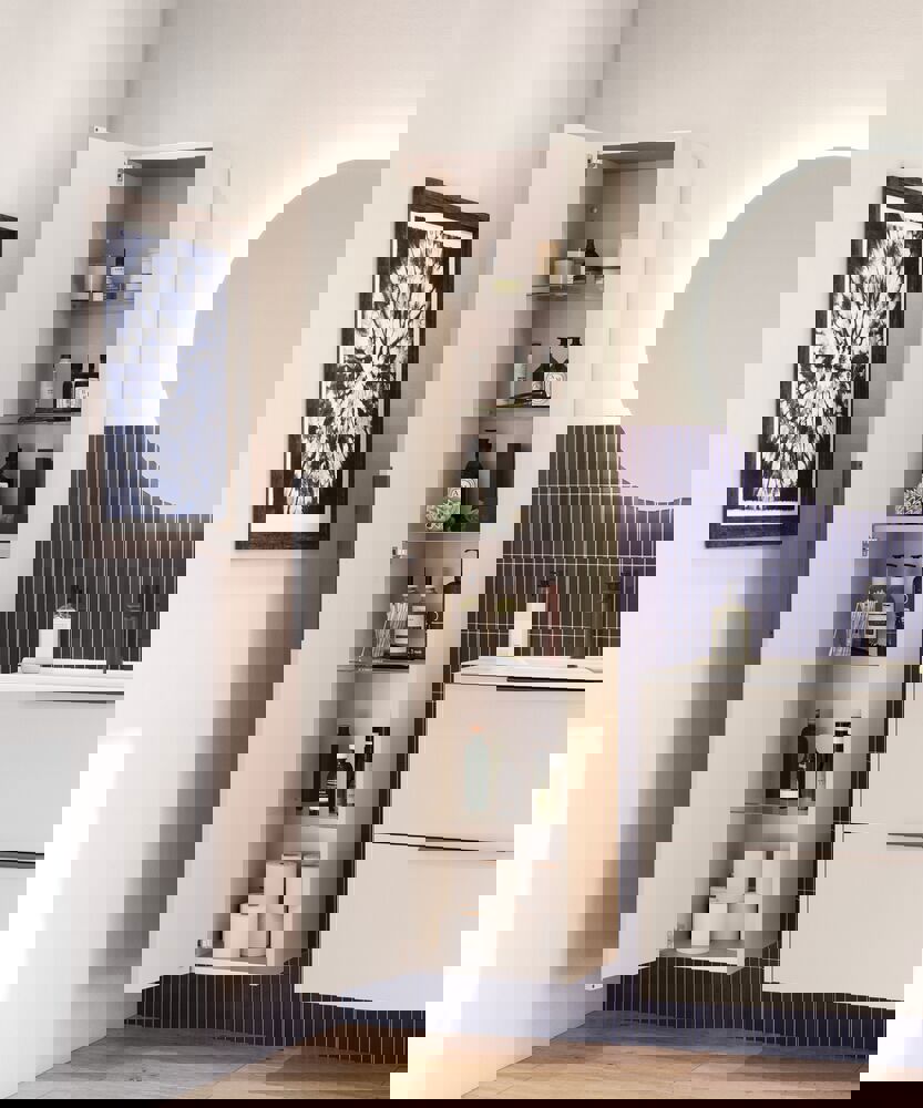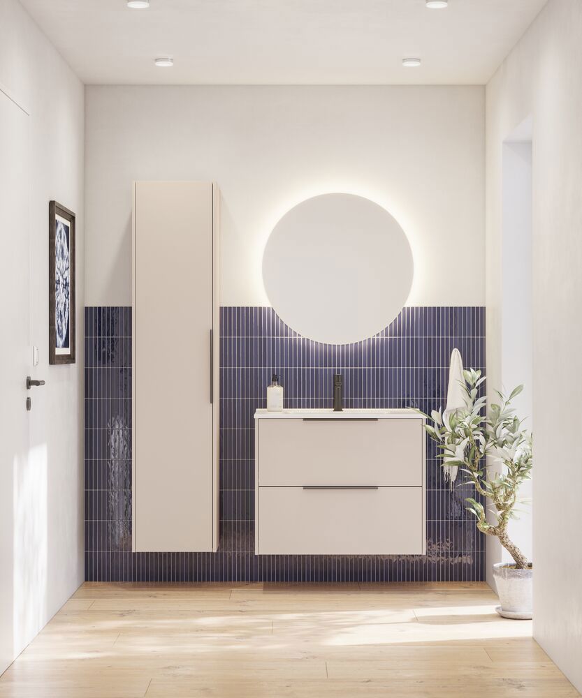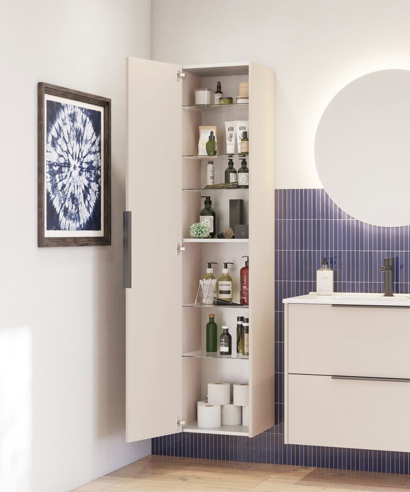 This tall cabinet combines the flexibility of a reversible door with an elegant fluted front that adds a modern touch to your bathroom. Inside you'll find a wooden shelf and 4 glass shelves, giving you plenty of space to organize your toiletries. The cabinet is available in white, sand or light blue, and the fitted handle makes the cabinet ready to use immediately.