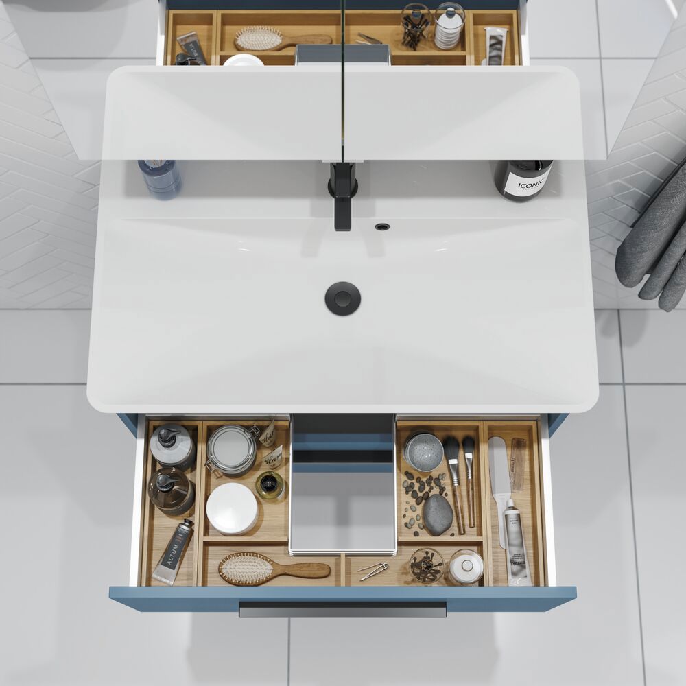 Take your morning to new heights with the Top mirror cabinet. This mirror cabinet has a lighting strip running the full cabinet width at the top of the cabinet, while inside you'll find plenty of storage space and an electrical socket with a switch. So you get much more than you might expect. Of course, the mirror cabinet is available with gables in beautiful colours, allowing you to create a uniform look in your bathroom.