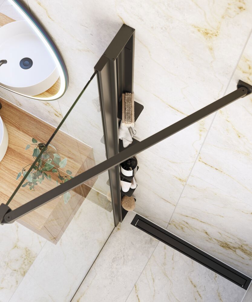 Tower is an innovative solution that provides exceptional storage space in the shower without compromising on aesthetics. Tower has 5 removable shelves that are perfect for organizing the products and care items you use in your shower. The practical hooks allow you to hang a sponge, a brush or other small items to have them close at hand. To accommodate Tower, simply choose a panel or door that is 10cm smaller than your installation. Tower is the ideal solution for those who want to optimise the space in their shower without compromising on style and functionality.