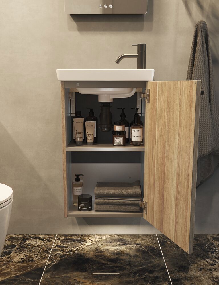 The 1-door vanity unit is the ideal solution for small bathrooms. With a projection of only 26 cm, it takes up minimal space while still providing practical storage. The stylish design fits perfectly with any decor. The unit is both functional and visually appealing, helping to bring order and elegance to your bathroom. Upgrade your bathroom with this vanity unit and enjoy the smart space-saving solution. NB: There is a start-up fee (BI2) for products with bespoke colour. It is an one-off surcharge per bespoke colour regardless number of products. Remember to add the little practical things to your bathroom furniture that you will enjoy on a daily basis. For example, lights in drawers and cabinets, built-in electrical sockets and dimmed sensor lights under the furniture to guide night-time bathroom visits. Options are ordered at the same time as your furniture.