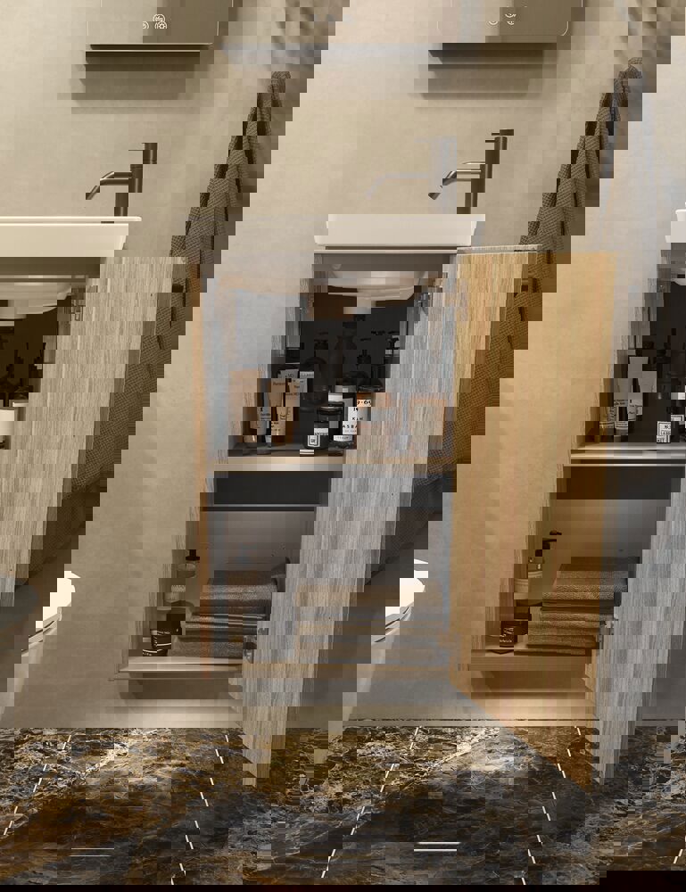 The 1-door vanity unit is the ideal solution for small bathrooms. With a projection of only 26 cm, it takes up minimal space while still providing practical storage. The stylish design fits perfectly with any decor. The unit is both functional and visually appealing, helping to bring order and elegance to your bathroom. Upgrade your bathroom with this vanity unit and enjoy the smart space-saving solution. NB: There is a start-up fee (BI2) for products with bespoke colour. It is an one-off surcharge per bespoke colour regardless number of products. Remember to add the little practical things to your bathroom furniture that you will enjoy on a daily basis. For example, lights in drawers and cabinets, built-in electrical sockets and dimmed sensor lights under the furniture to guide night-time bathroom visits. Options are ordered at the same time as your furniture.
