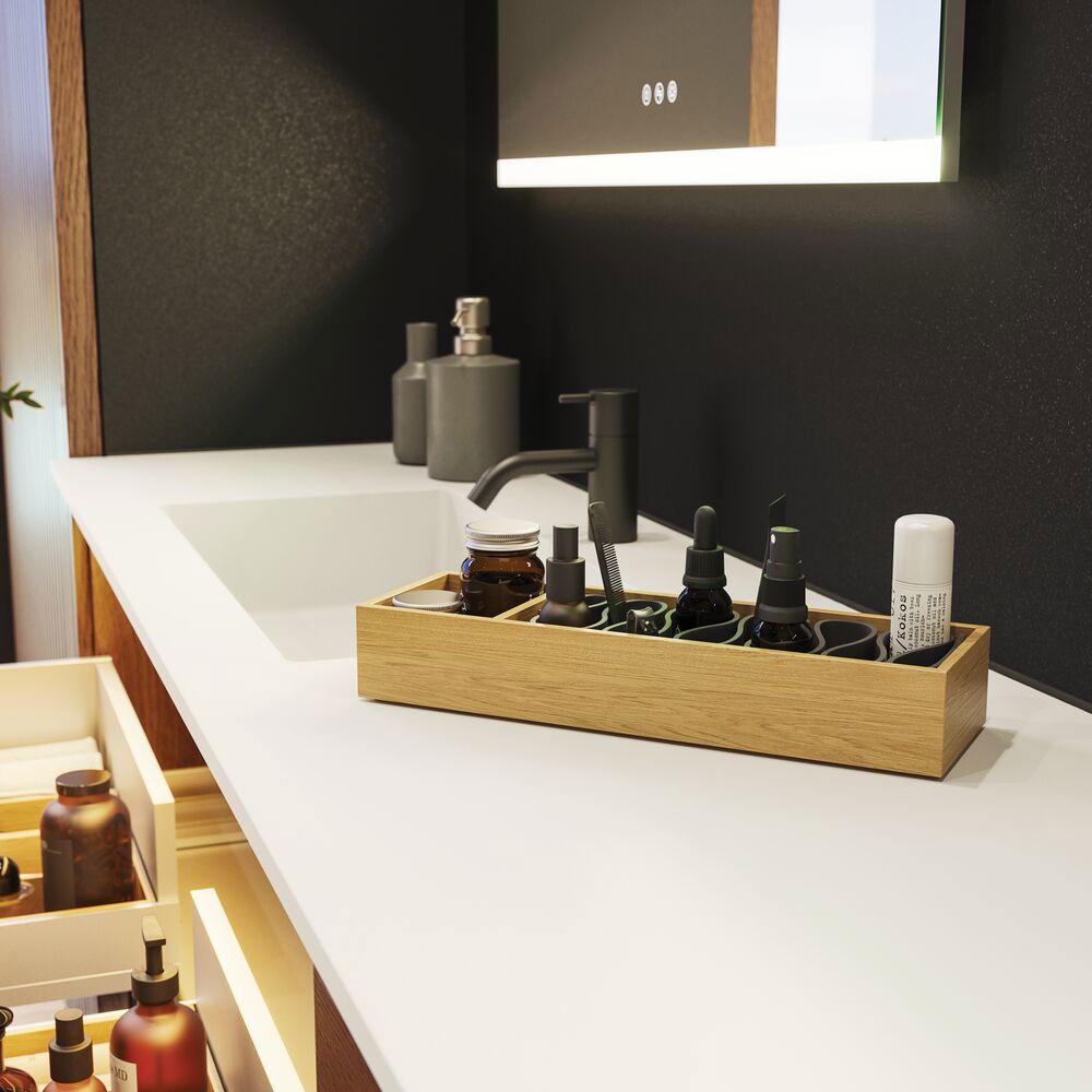 Upgrade your bathroom with style and functionality with a vanity unit. The smart, single-drawer design gives you the perfect storage solution for your bathroom products. Keep your bathroom tidy and organized with this elegant unit that fits in with any decor. The vanity unit is available in several different colors, so you can choose the one that best suits your style. NB: There is a start-up fee (BI2) for products with bespoke colour. It is an one-off surcharge per bespoke colour regardless number of products. Remember to add the little practical things to your bathroom furniture that you will enjoy on a daily basis. For example, lights in drawers and cabinets, built-in electrical sockets and dimmed sensor lights under the furniture to guide night-time bathroom visits. Options are ordered at the same time as your furniture.