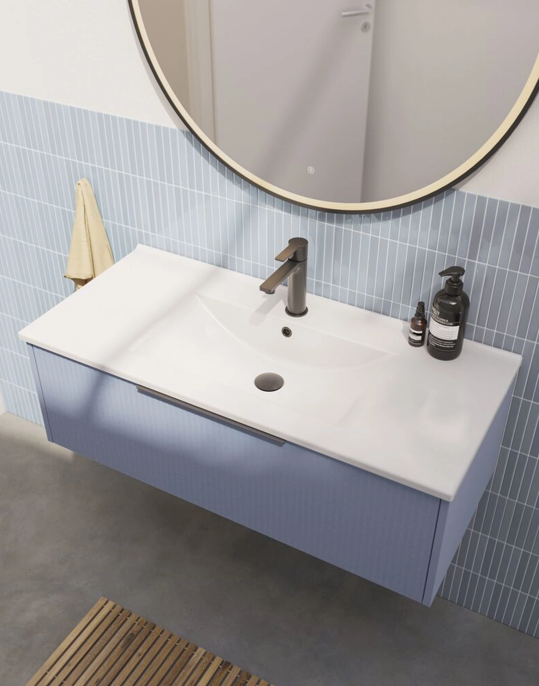 This vanity unit combines functionality and style with its 2 spacious drawers and an elegant striped front. Available in white, sand or light blue, this cabinet will give your bathroom a modern and unique look. The drawers offer plenty of storage space and the handles are fitted and ready to use.