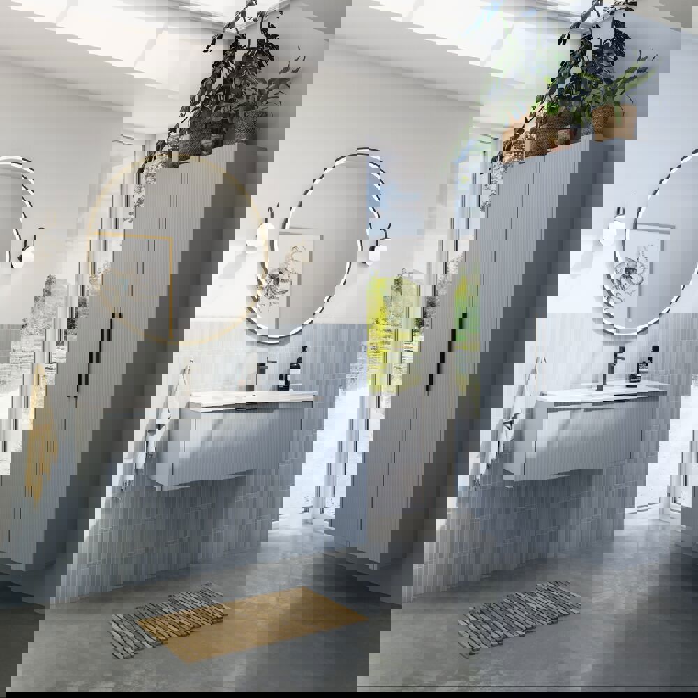 This vanity unit combines functionality and style with its 2 spacious drawers and an elegant striped front. Available in white, sand or light blue, this cabinet will give your bathroom a modern and unique look. The drawers offer plenty of storage space and the handles are fitted and ready to use.