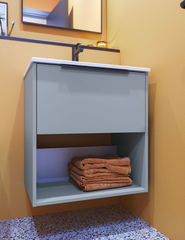 This vanity unit combines functionality and style with its 2 spacious drawers and an elegant striped front. Available in white, sand or light blue, this cabinet will give your bathroom a modern and unique look. The drawers offer plenty of storage space and the handles are fitted and ready to use.