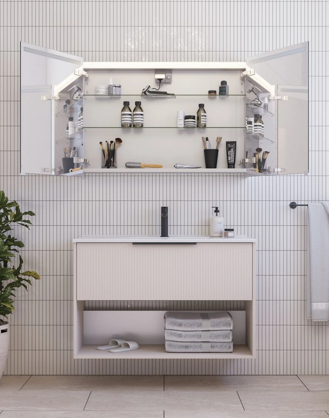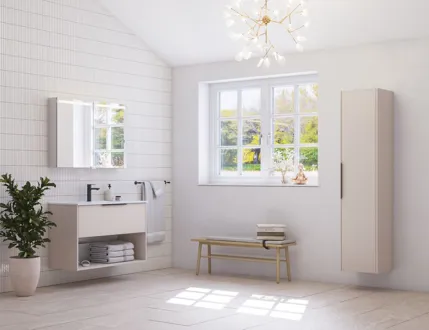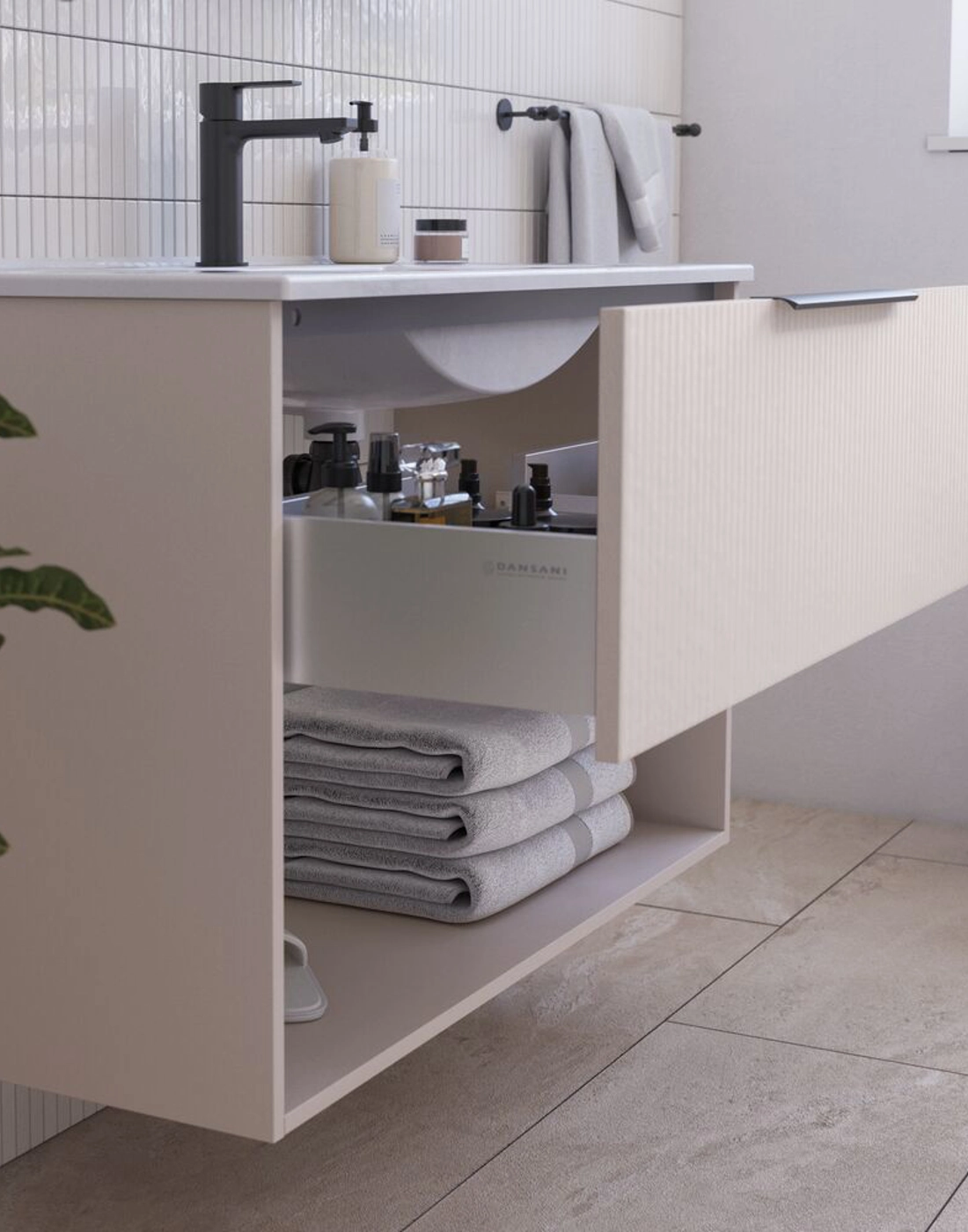 This vanity unit combines functionality and style with its 2 spacious drawers and an elegant striped front. Available in white, sand or light blue, this cabinet will give your bathroom a modern and unique look. The drawers offer plenty of storage space and the handles are fitted and ready to use.