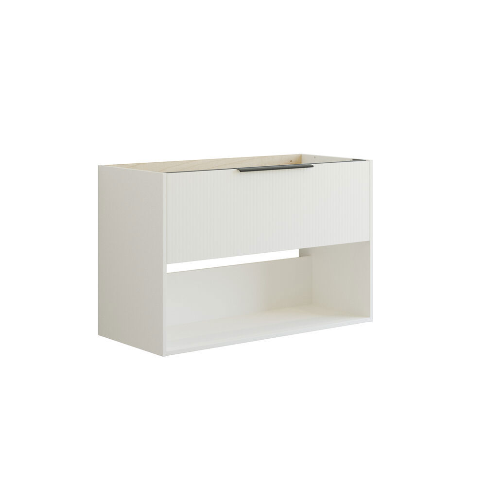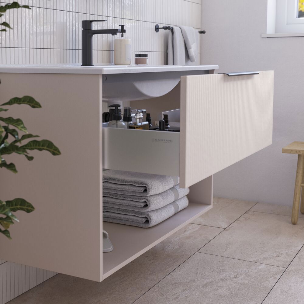 This vanity unit combines functionality and style with its 2 spacious drawers and an elegant striped front. Available in white, sand or light blue, this cabinet will give your bathroom a modern and unique look. The drawers offer plenty of storage space and the handles are fitted and ready to use.