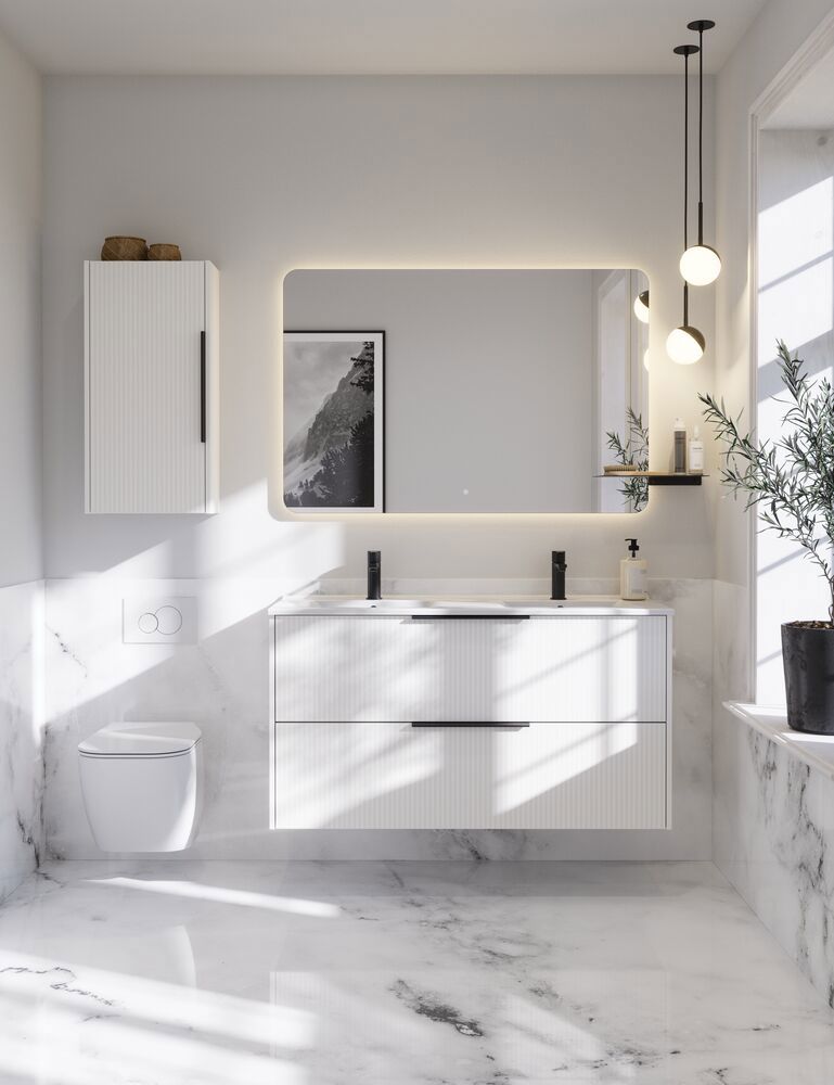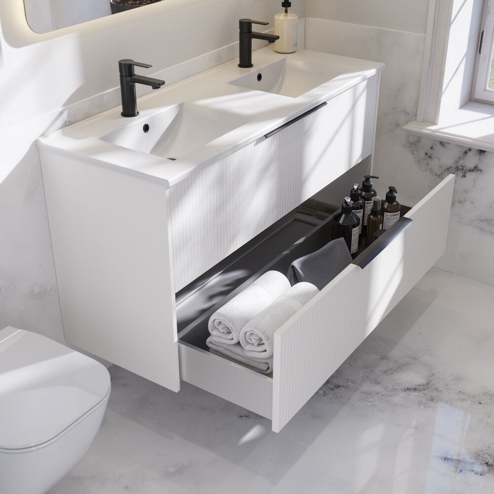 This vanity unit combines functionality and style with its 2 spacious drawers and an elegant striped front. Available in white, sand or light blue, this cabinet will give your bathroom a modern and unique look. The drawers offer plenty of storage space and the handles are fitted and ready to use.