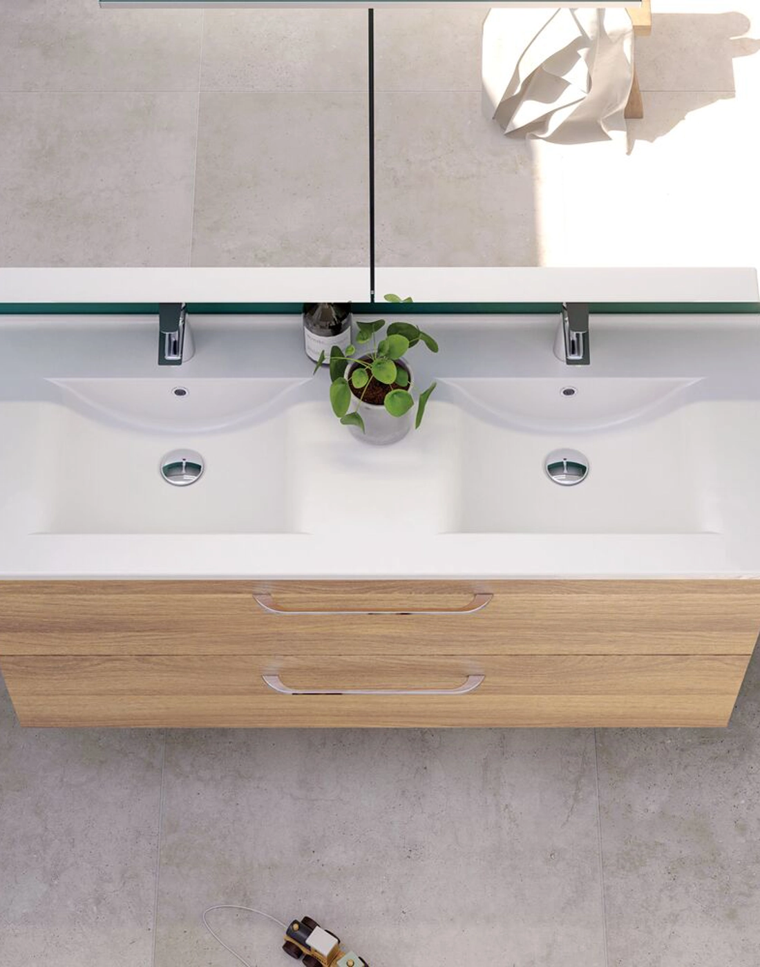 Here's a beautiful vanity unit from Dansani Mido+ with 2 drawers and designed for use with either a single or a double basin. The vanity unit is 120cm wide and is the perfect solution if you have extra space in your bathroom. You can use either a 120cm single basin or a 120cm double basin to suit your requirements. With a double basin, you can have two people at the basin at the same time, and you can even each have your own basin. As mentioned, the vanity unit is available with 2 drawers for extra storage of all your bathroom items. All Mido+ cabinets come with the classic Base handle in chrome. You can choose a different handle for a different look, but remember that it must be ordered together with your furniture. Remember to add the little practical things to your bathroom furniture that you will enjoy on a daily basis. For example, lights and drawer dividers in drawers.
