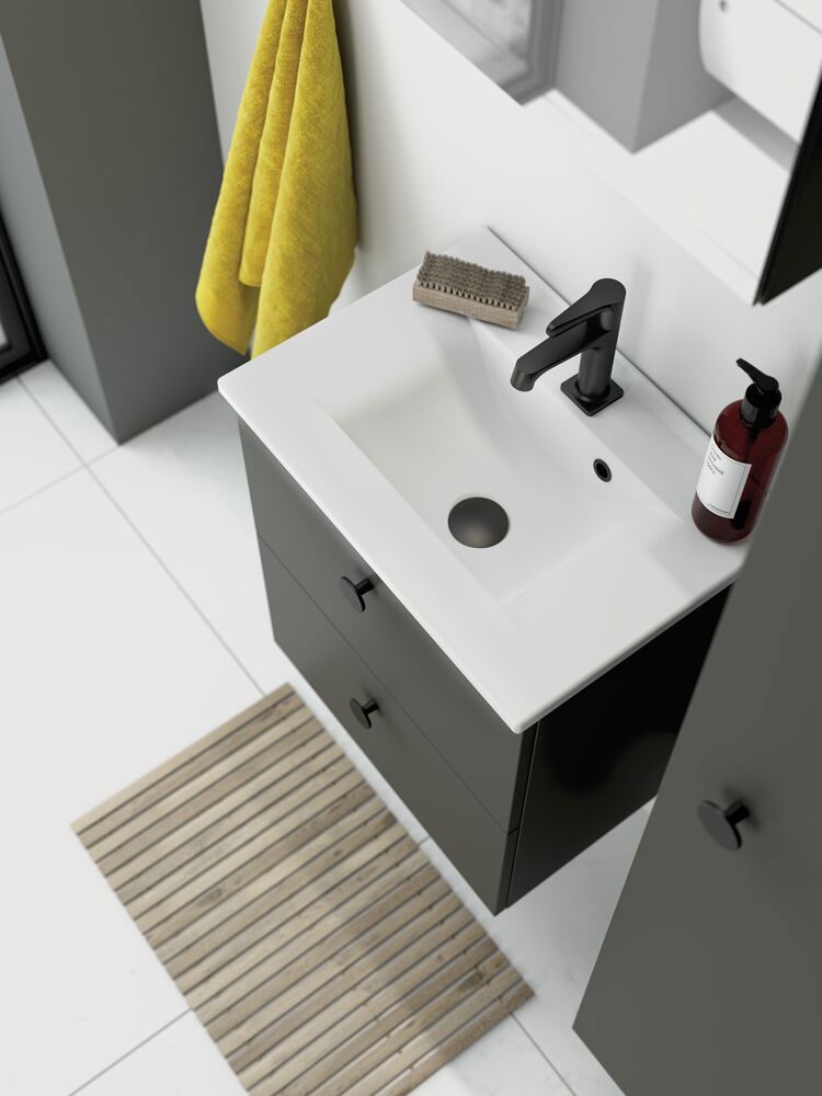 Dansani Mido+ is the feeling of luxury at an affordable price, and here you get a 2-drawer vanity unit. This beautiful vanity unit is only 35cm projection and is therefore designed to fit perfectly into smaller bathrooms or guest bathrooms. The Dansani Mido+ vanity unit is Danish design at an attractive price, and of course you'll also find several smart options such as drawer lighting and wooden trays for storage. With the Dansani Mido+ 2-drawer vanity unit, you not only get functionality and storage, but also the freedom to create your dream bathroom. Please note that this vanity unit has two cut-outs to suit floor exiting wastes. All Mido+ cabinets come with the classic Base handle in chrome. You can choose a different handle for a different look, but remember that it must be ordered together with your furniture. Remember to add the little practical things to your bathroom furniture that you will enjoy on a daily basis. For example, lights and drawer dividers in drawers.