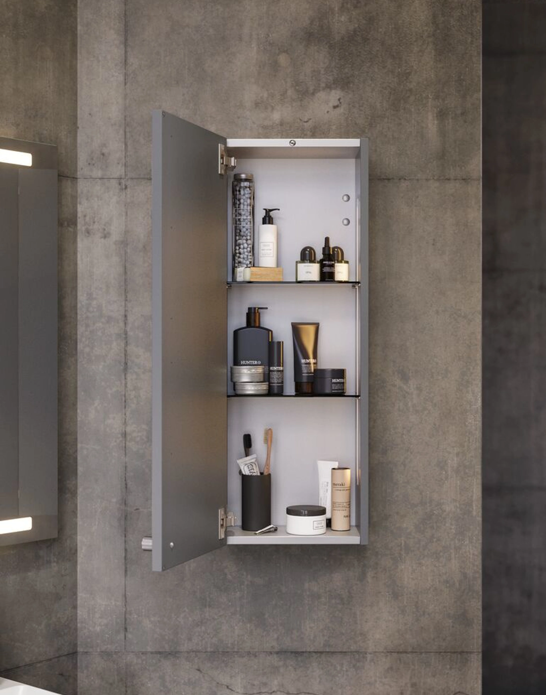 Declutter and organise your bathroom with wall cabinets. Available with 2 glass shelves, this smart cabinet is both stylish and functional. Use the cabinet for storage in your bathroom to keep your creams, deodorants, etc. organised. The cabinet is available in many different colours to match the rest of your bathroom, of course. NB: There is a start-up fee (BI2) for products with bespoke colour. It is an one-off surcharge per bespoke colour regardless number of products. Remember to add the little practical things to your bathroom furniture that you will enjoy on a daily basis. For example, lights in drawers and cabinets, built-in electrical sockets and dimmed sensor lights under the furniture to guide night-time bathroom visits. Options are ordered at the same time as your furniture.