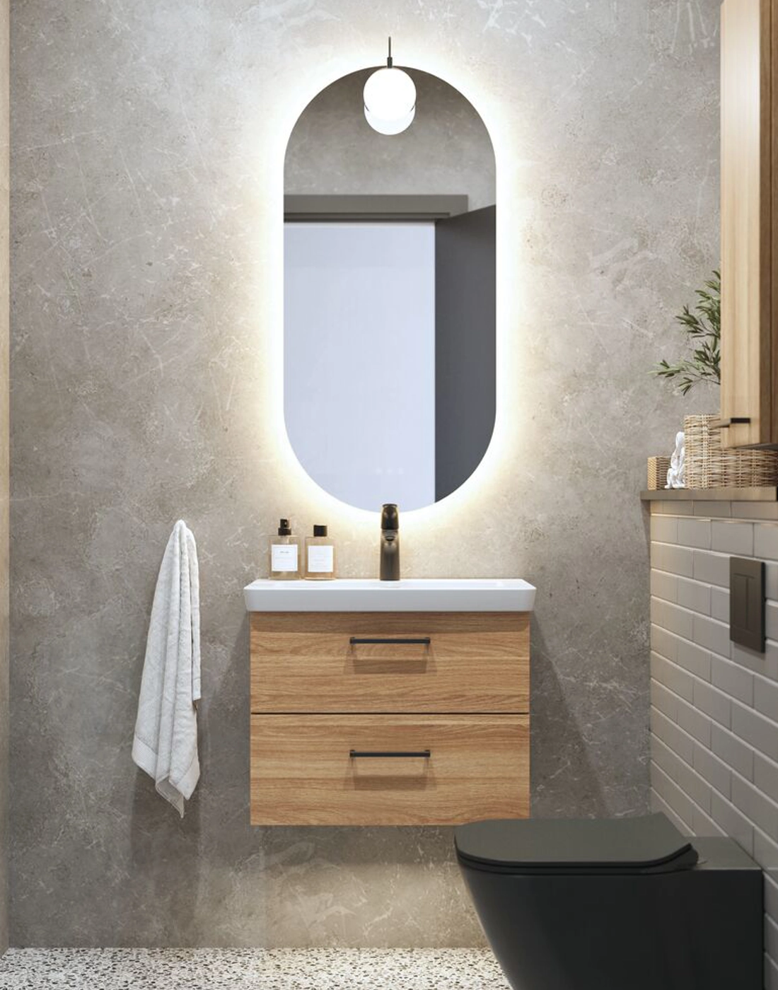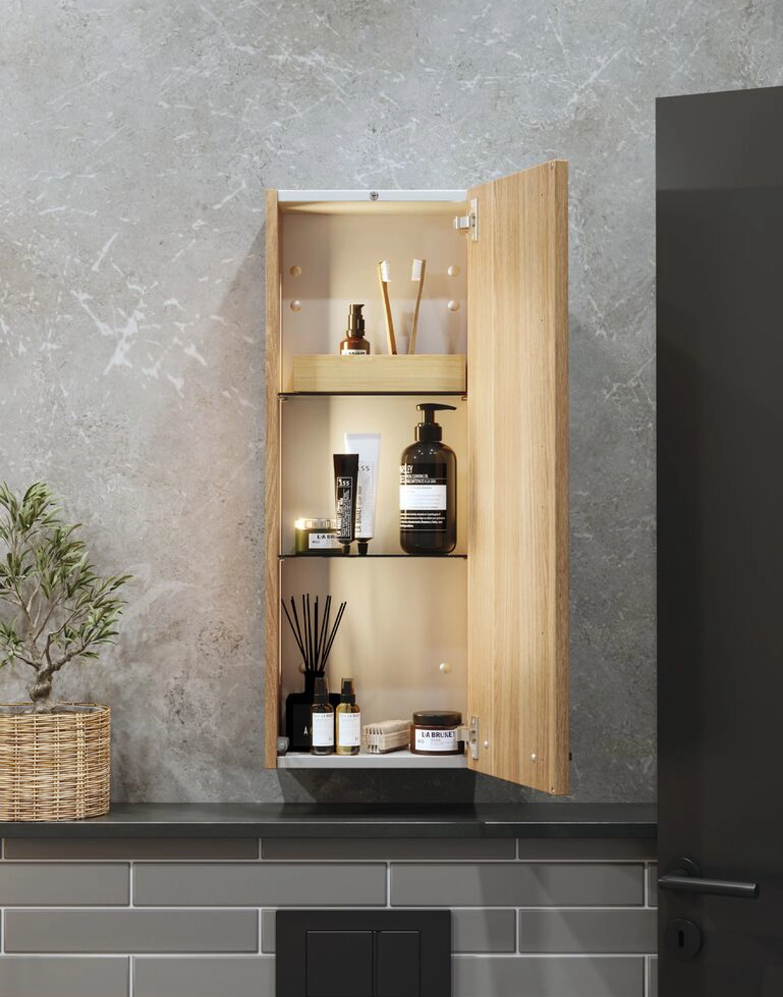 Declutter and organise your bathroom with wall cabinets. Available with 2 glass shelves, this smart cabinet is both stylish and functional. Use the cabinet for storage in your bathroom to keep your creams, deodorants, etc. organised. The cabinet is available in many different colours to match the rest of your bathroom, of course. NB: There is a start-up fee (BI2) for products with bespoke colour. It is an one-off surcharge per bespoke colour regardless number of products. Remember to add the little practical things to your bathroom furniture that you will enjoy on a daily basis. For example, lights in drawers and cabinets, built-in electrical sockets and dimmed sensor lights under the furniture to guide night-time bathroom visits. Options are ordered at the same time as your furniture.