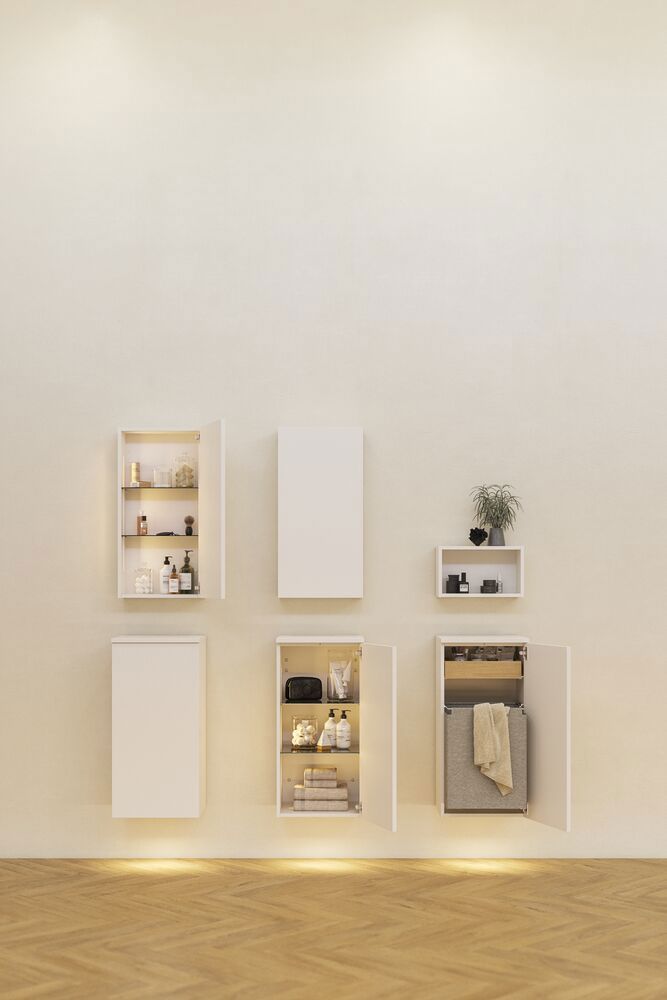 Declutter and organise your bathroom with wall cabinets. Available with 2 glass shelves, this smart cabinet is both stylish and functional. Use the cabinet for storage in your bathroom to keep your creams, deodorants, etc. organised. The cabinet is available in many different colours to match the rest of your bathroom, of course. NB: There is a start-up fee (BI2) for products with bespoke colour. It is an one-off surcharge per bespoke colour regardless number of products. Remember to add the little practical things to your bathroom furniture that you will enjoy on a daily basis. For example, lights in drawers and cabinets, built-in electrical sockets and dimmed sensor lights under the furniture to guide night-time bathroom visits. Options are ordered at the same time as your furniture.