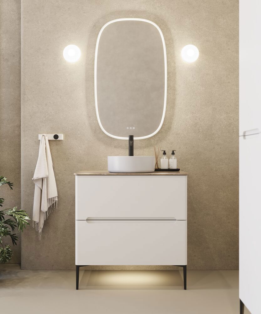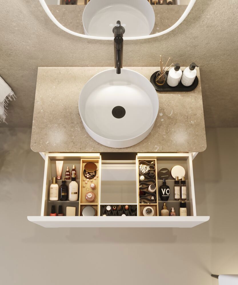 Silestone worktops with rounded corners combine exclusive design with high performance - and fit beautifully with the Vintage series with integrated handles, where the furniture also has the soft, rounded shapes. The result is a harmonious whole in the bathroom, where both furniture and worktop speak the same design language. Made from natural quartz through an advanced technological process, the surface is strong, stain-resistant and easy to maintain. The hard, smooth finish makes the worktop resistant to everyday wear and tear while retaining its luxurious appearance for many years. Silestone is available in a wide range of colors and patterns - from classic, timeless white to bold shades - so you can create exactly the look that suits your personal style. Whatever your choice, the countertop will add a touch of elegance and sophistication to your bathroom. Please note that the color of the worktop may differ from the image shown. We therefore recommend that you see a physical sample at a retailer before you decide.